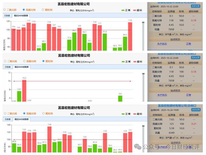 莒县宏胜建材有限公司:“不甘落后”,氮氧化物和颗粒物的小时值数据同样亮起“红灯”。