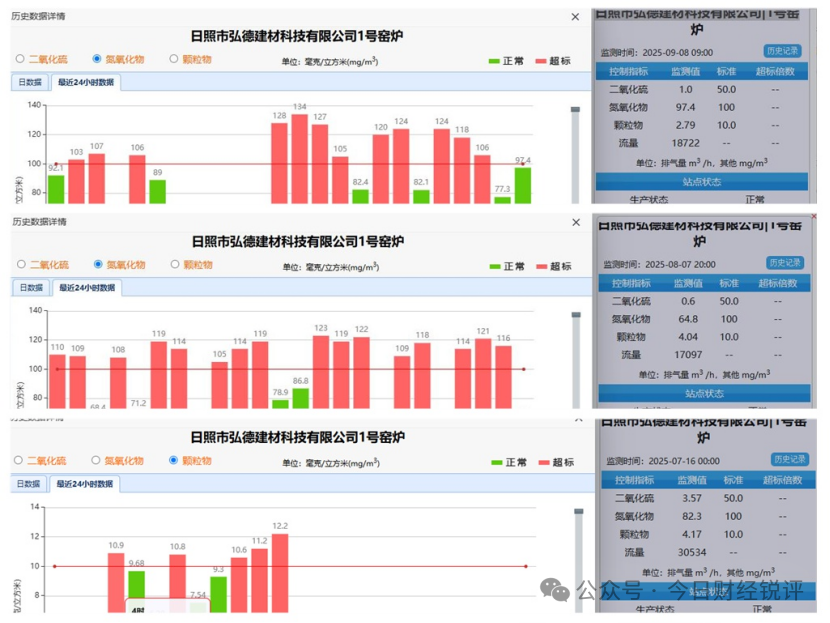 日照市弘德建材科技有限公司:其1号、2号窑炉的氮氧化物、颗粒物排放数据频频“爆表”,小时值超标已成家常便饭,9月份2号窑炉的颗粒物日均值也未能幸免。