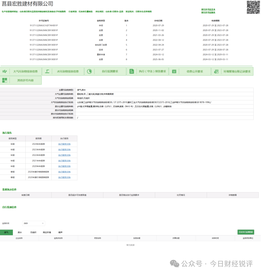 在全国排污许可证管理信息平台查询自行监测数据时,莒县宏胜建材有限公司的自行监测信息栏竟一片空白,赫然显示“暂无数据”。