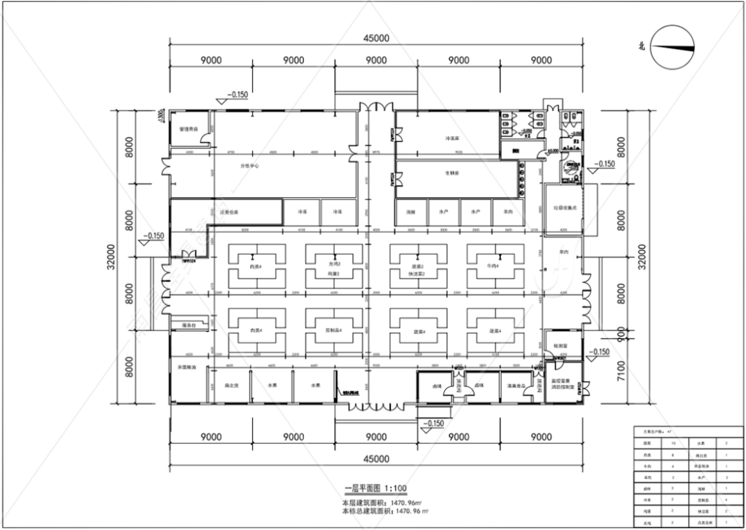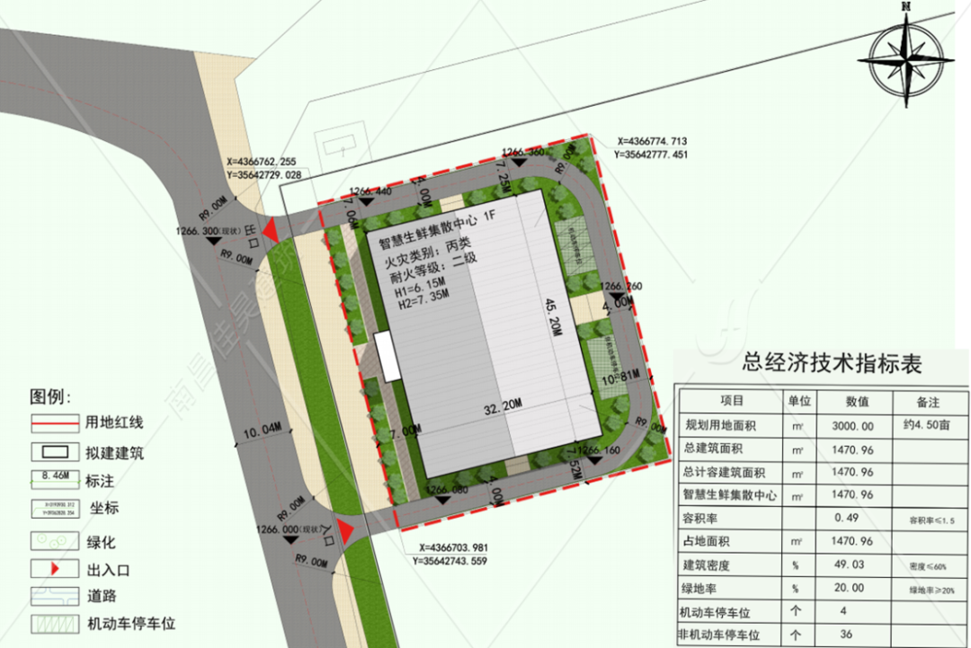 项目总用地面积为3000㎡,约合4.50亩,总建筑面积达1470.96㎡。根据区域功能定位与生鲜交易的实际需求,项目拟建层数为一层,主体功能为智慧生鲜集散中心。