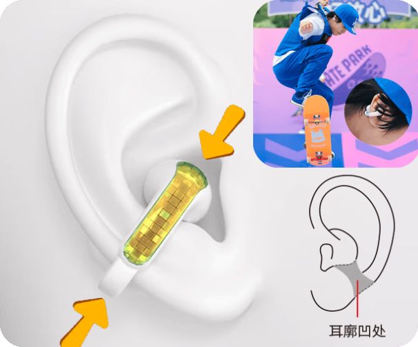 ▲耳机采用45度斜挂式设计,上下互扣佩戴方式。先将发音单元放入耳蜗,轻轻旋转至人体耳廓凹处,再将电池仓轻轻扣住即可完成佩戴。耳机外形采用人体工学设计,轻量化设计仅重5.5克,巧妙分配重量,自然垂挂。IP54防水性能不惧日常风雨天气,可全天候云感佩戴,音束更集中,漏音率更低,即使是较为剧烈的运动,也能保持稳固不易掉落。