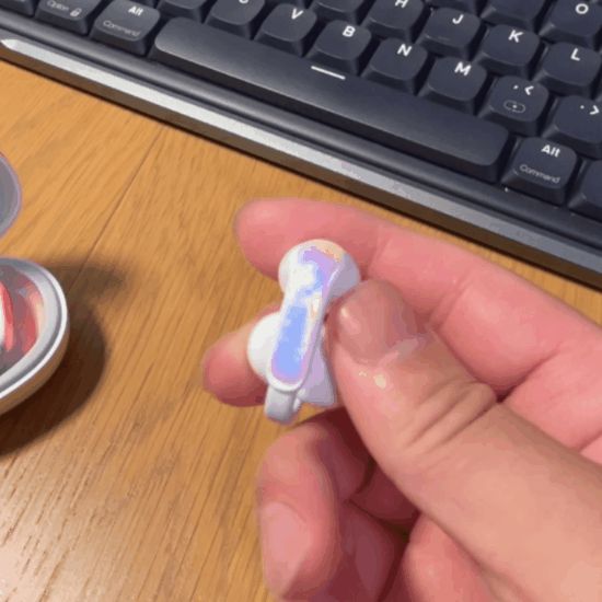 ▲耳机两侧的默认饰片为:幻彩云纹,饰片内部由多种细小反射颗粒填充,在不同光线折射下会有不同的视觉颜色体验,作为默认饰片已经足够出彩。