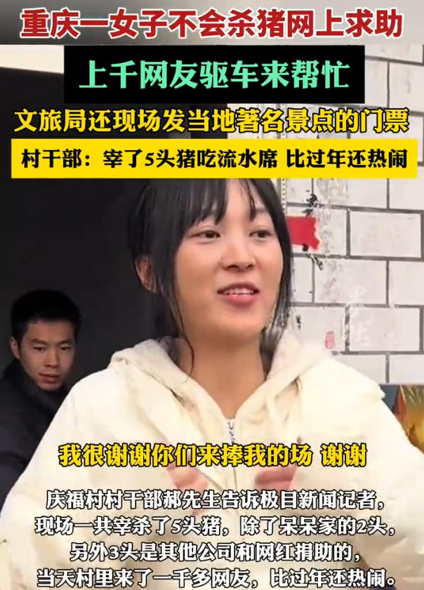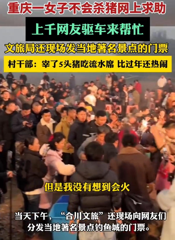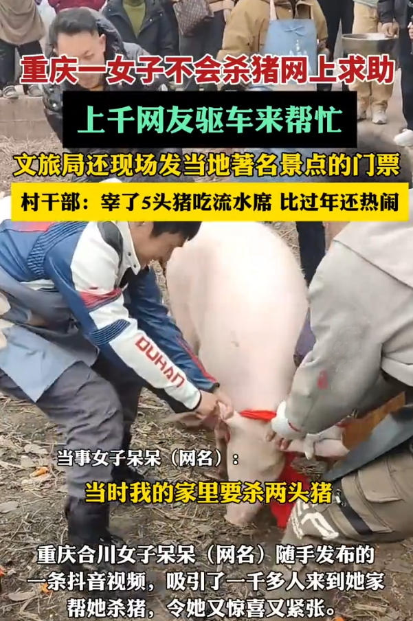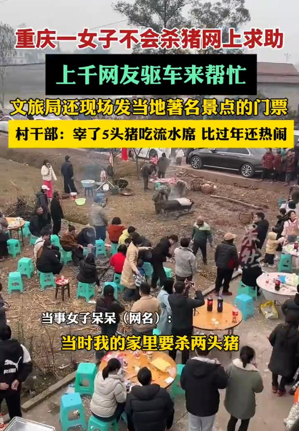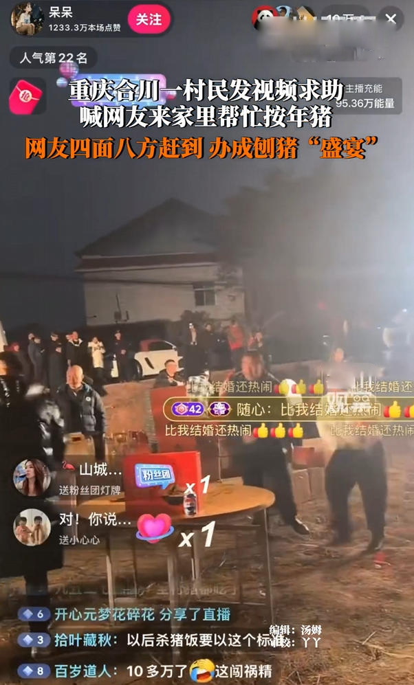 更魔幻的是,原本只想找几个帮手,最后竟来了一千多人;说好杀两头猪,结果宰了五头;自家院子摆起流水席,直播间10万人在线围观……这恐怕是今年开年最“出圈”的乡村互助故事。