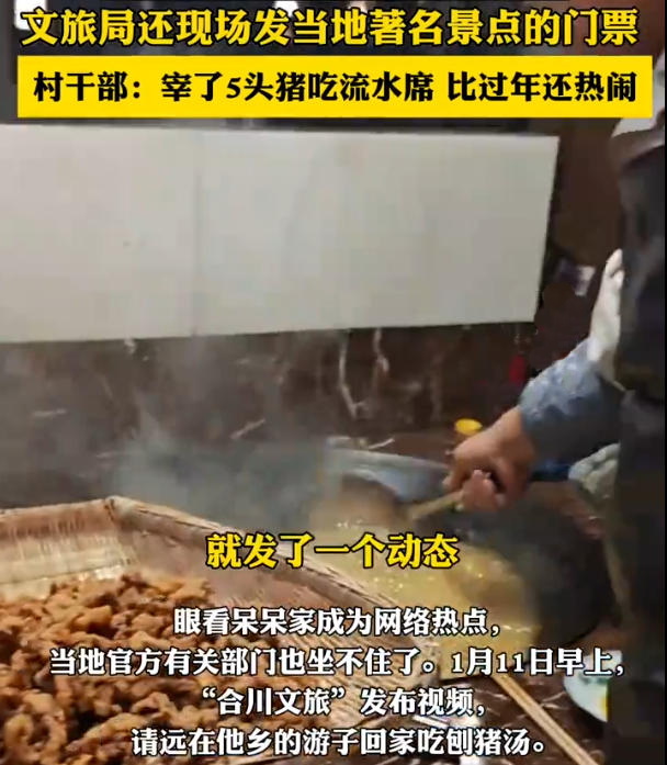 村里紧急协调,又有企业和网红赞助了三头猪,村干部、派出所全员出动,指挥交通、维持秩序,院子里架起大锅、摆开桌椅,直接办起午晚两轮流水席。