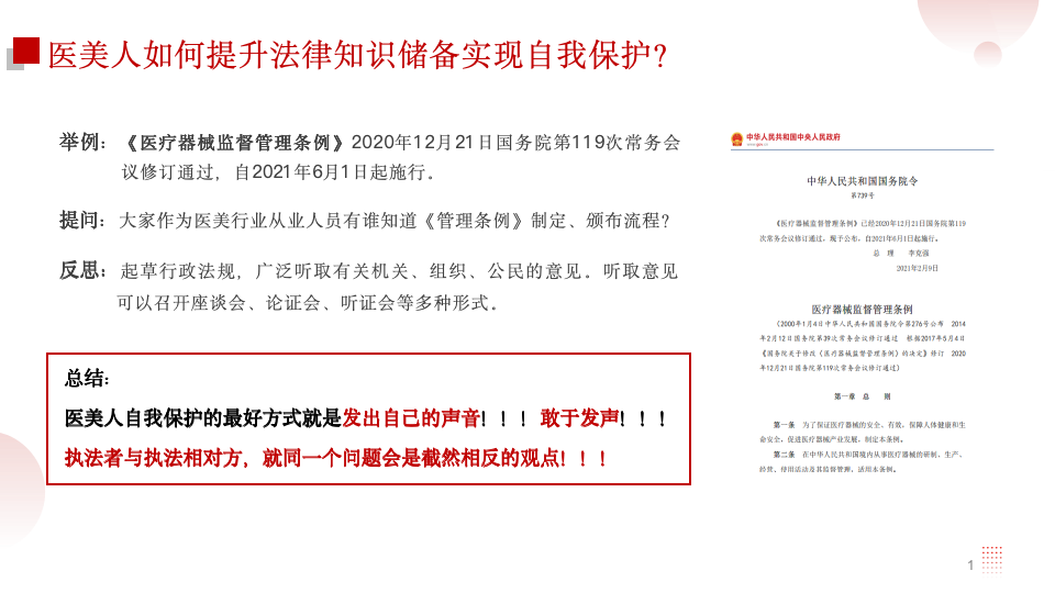 请大家看《医疗器械监督管理条例》。在医美行业中医疗器械监管条例是和我们息息相关的管理条例,我敢打赌在座的诸位没有任何一个人知道这样的条例是如何制定出来的,但是这种跟我们息息相关的条例却深刻的影响着我们日常的经营活动,那么,在这种情况下我们应该如何去自我保护呢?答案便是“敢于发出自己的声音”!