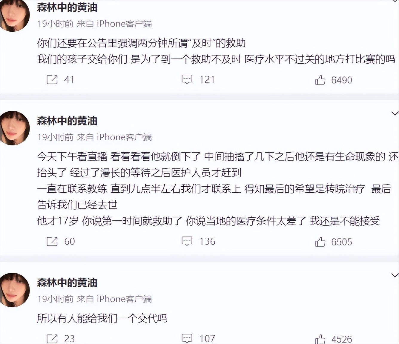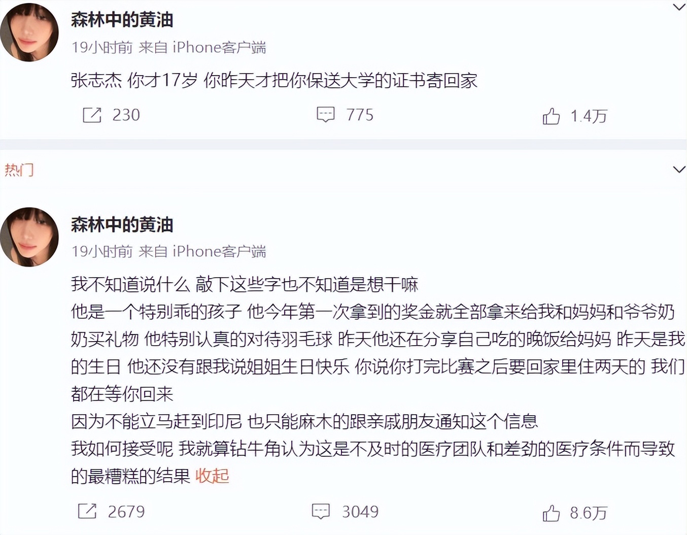 另据张志杰姐姐透露,保送大学的证书刚送到家里。张志杰曾说打完比赛之后要回家里住两天的,家里人都在等他回来,结果天人永隔,令人痛彻心扉。而主办方医疗团队太过业余,有网友表示“三个人到场应该马上进行人工呼吸和胸部按压,一个人马上拿aed过来除颤。而不是等救护车,主办方难辞其咎,中国羽协应启动追责”,对此,你怎么看呢?