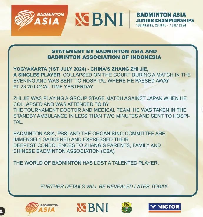 中国羽毛球届的未来之星张志杰,在17岁(张志杰生于2007年1月30日)的花样年华意外离世,而这与2024年亚洲青年羽毛球锦标赛主办方的医疗团队太业余有莫大关系,主办方及医疗团队责任重大难辞其咎,中国羽协应启动追责。