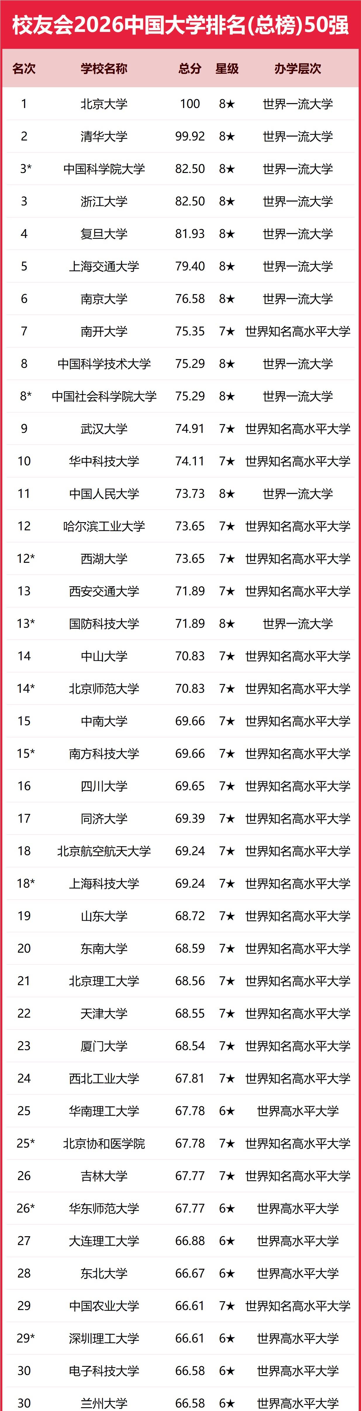 今日话题:对于校友会2026中国大学排名30强名单,你怎么看?