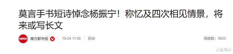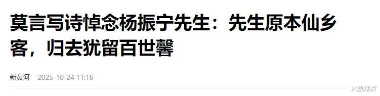 10月24日,杨振宁遗体告别仪式的这一天,莫言与好友在以《大师归去 高见永存》为题发文悼念杨振宁。