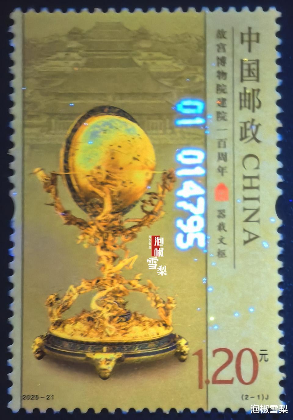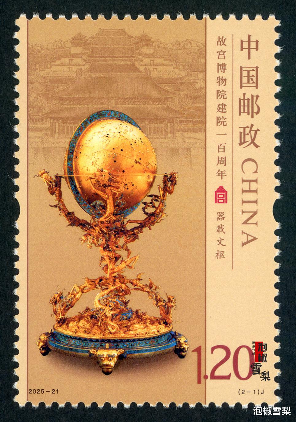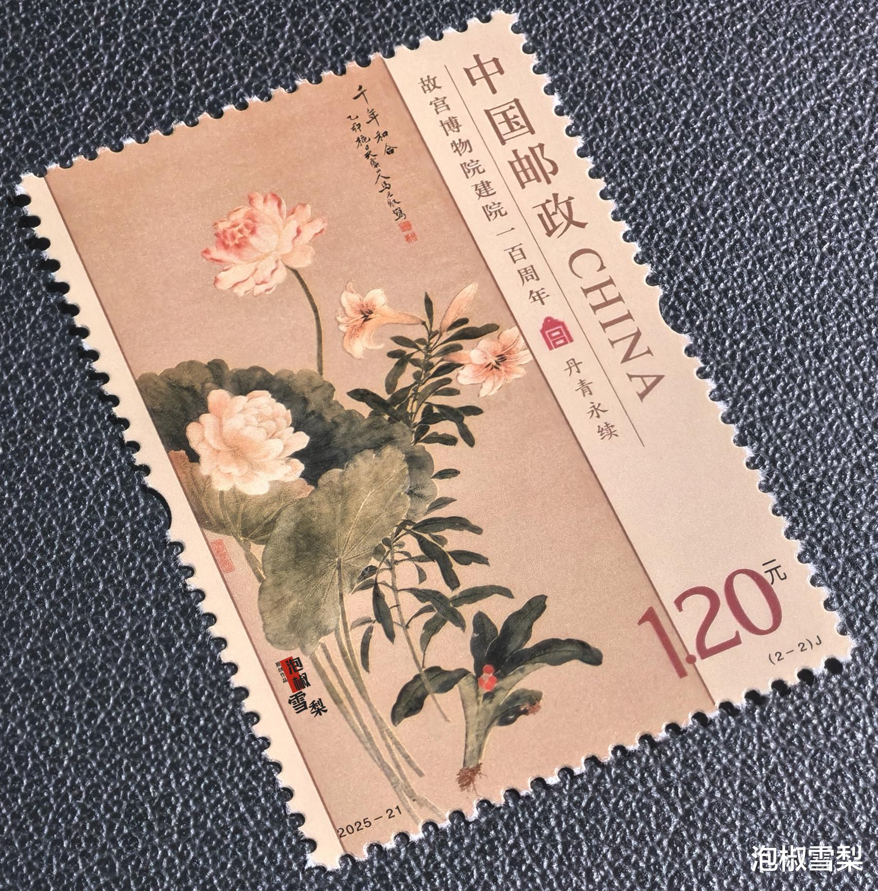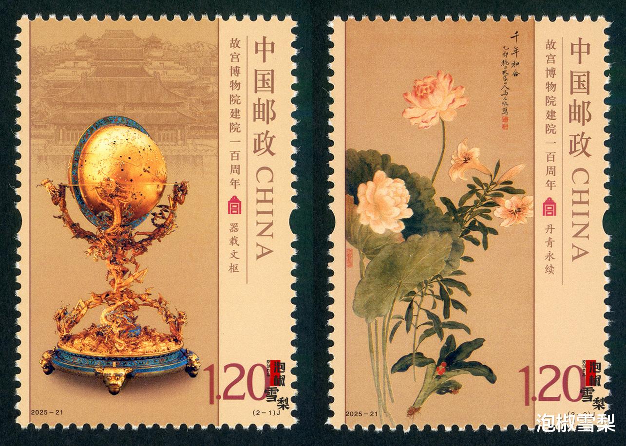2025年10月10日,中国邮政发行《故宫博物院建院一百周年》邮票1套2枚,版式一12枚,版式二4套8枚,北京邮票厂胶版印刷,设计者尹晓飞,计划发行量套票490万套,版式二69.3万版,折合套票277.2万套,全部总面值1841.28万元。