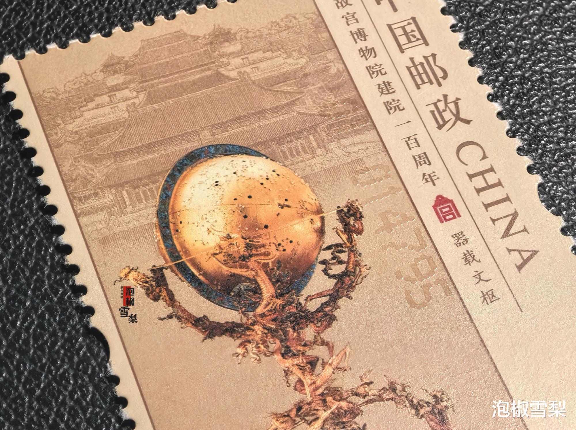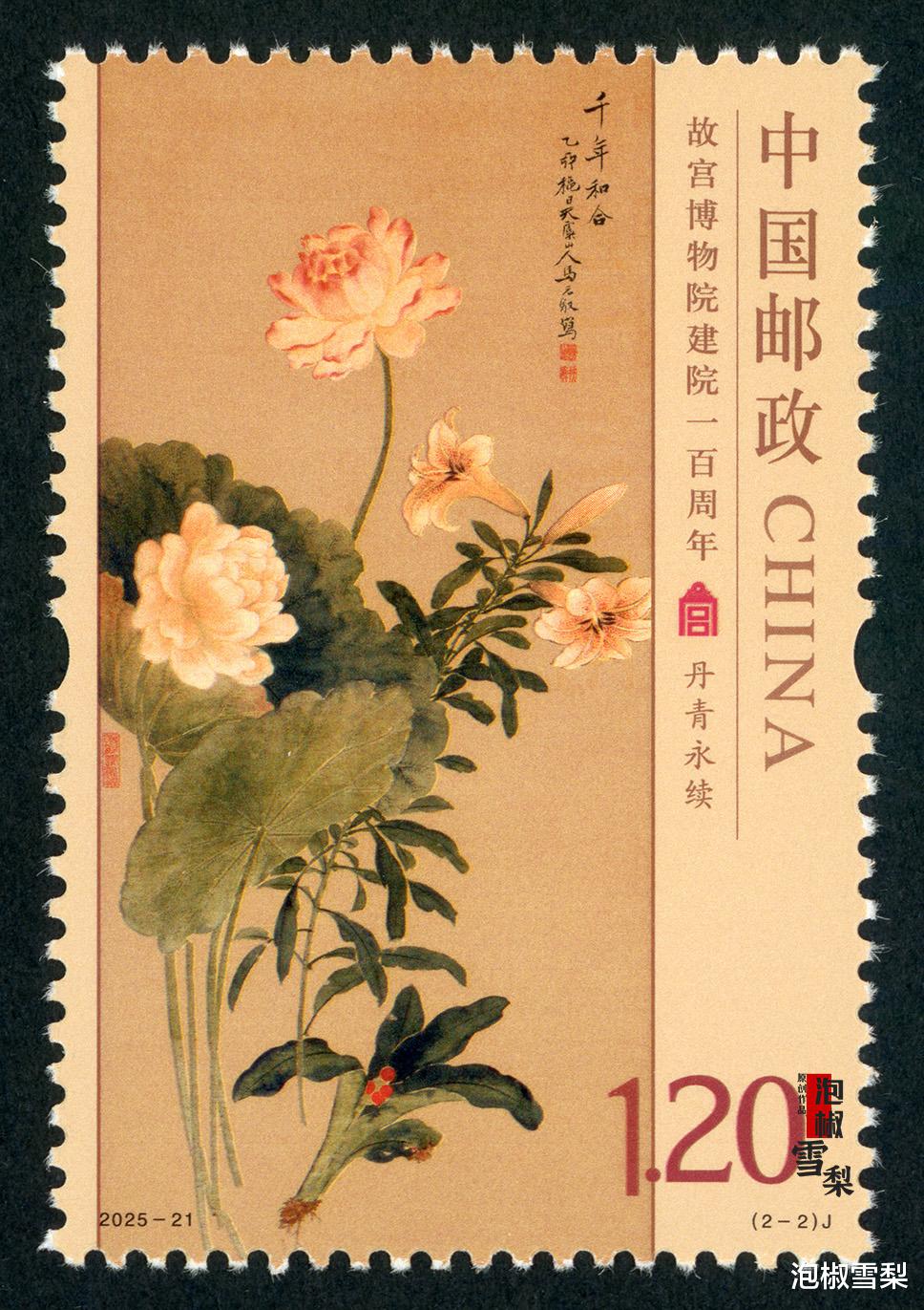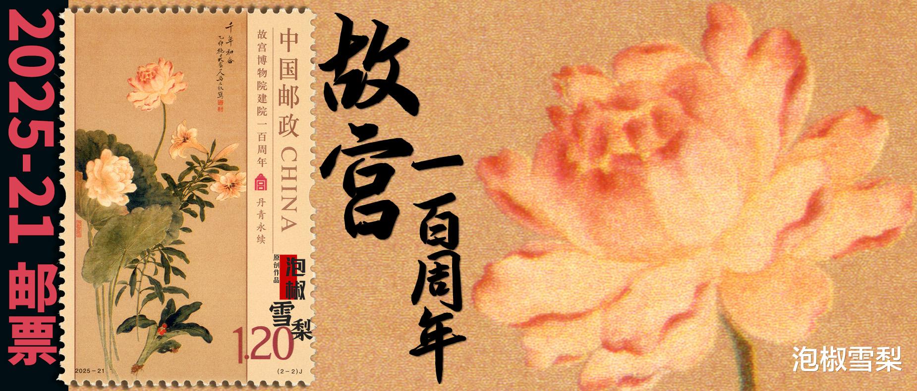 2025年10月10日,中国邮政发行《故宫博物院建院一百周年》邮票1套2枚,版式一12枚,版式二4套8枚,北京邮票厂胶版印刷,设计者尹晓飞,计划发行量套票490万套,版式二69.3万版,折合套票277.2万套,全部总面值1841.28万元。
