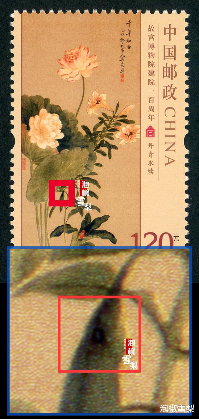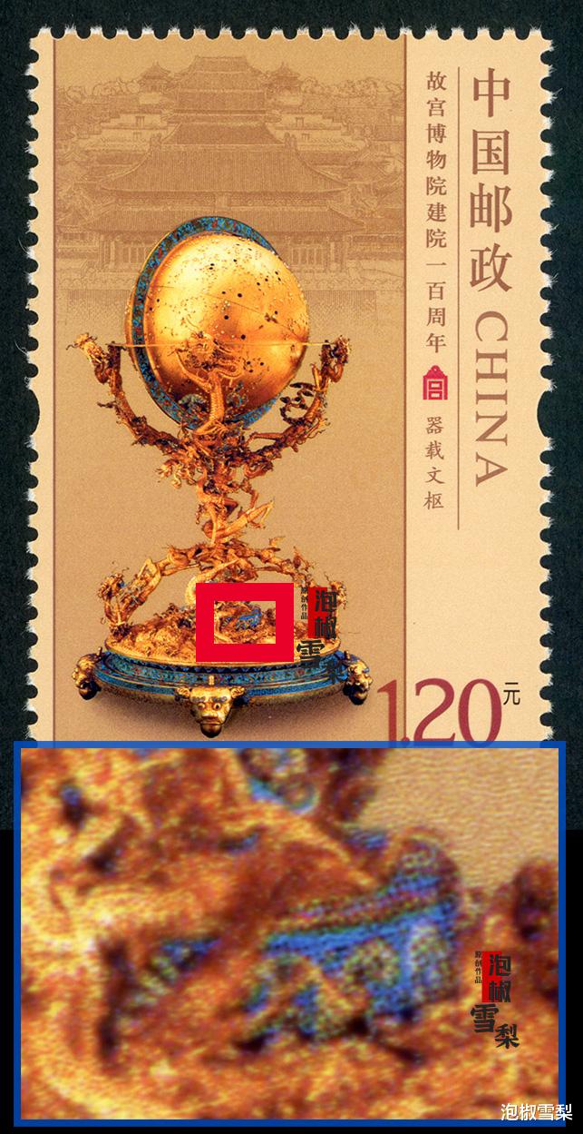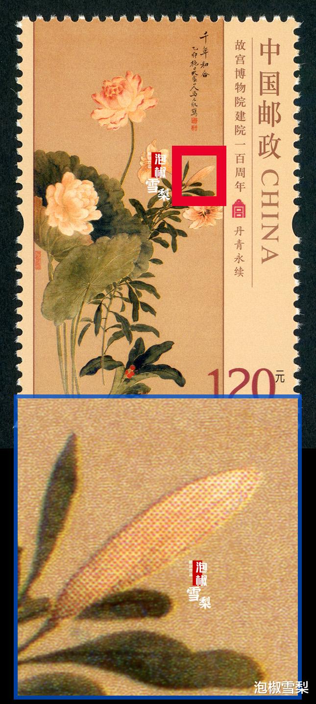 邮票实物看上去比设计稿好看许多,古画色调也运用的恰到好处,虽然放大时略微能够看到些套色偏移,但瑕不掩瑜,邮票整体的表现效果称得上精品二字,如果再将铭记改为行楷或者篆书,效果可能会更好。