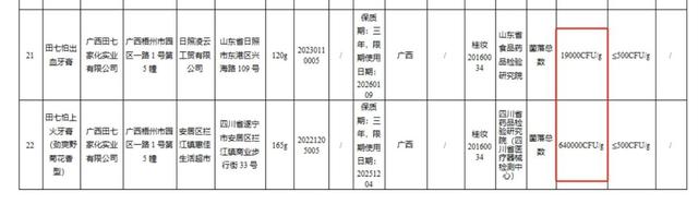 其中,田七怕出血牙膏、田七怕上火牙膏(劲爽野菊花香型)这两款产品的菌落检测结果为19000CFU/g和640000CFU/g,即分别为规定菌落数据的38倍、1280倍。