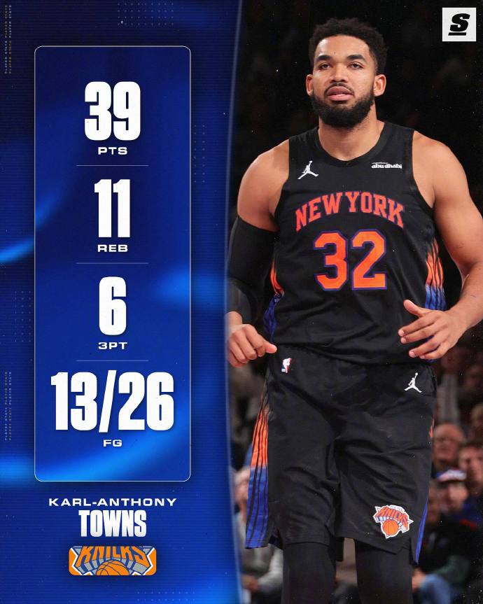 布伦森和阿努诺比今天因伤缺席,唐斯大发神威,出战38分钟,26投13中,三分14中6,罚球9中7,砍下39分11篮板4助攻,正负值+13全场最高。值得一提的是,唐斯今天只差一分就能拿到赛季首次40+,而他上半场打了20分钟,16投11中,三分10中6,罚球3中3,就已经砍下31分,但最终还是无缘40+。
