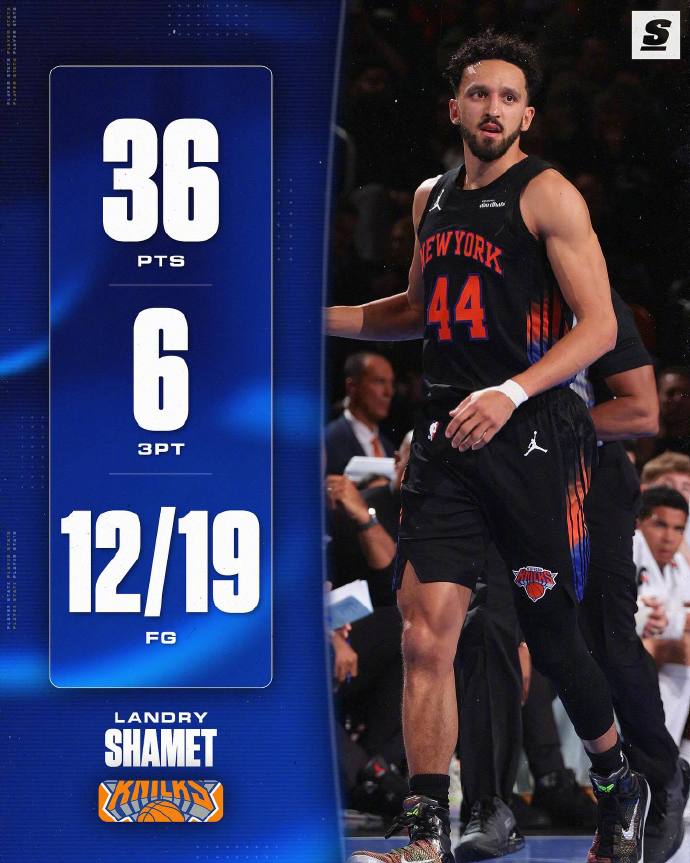 沙梅特也迎来大爆发,成为替补席上的奇兵,手感十分火热,全场替补出场36分钟,投篮19中12,三分12中6,罚球6中6,砍下赛季新高的36分,也创造了本赛季替补球员得分纪录。另外,沙梅特还是2013年的JR·史密斯之后,尼克斯队史替补单场得分最多的球员。