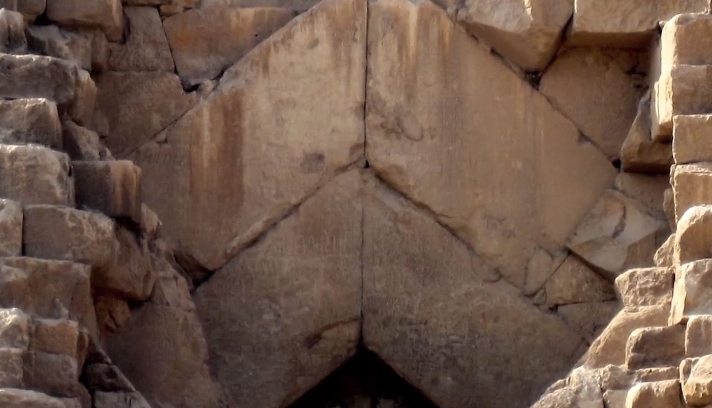 在正面距离地面13米高的地方,有一个用4块巨石砌成的三角形出入口。这个入口如果当时建造成常规的四边形,金字塔本身的巨大压力早就已经把这个入口压塌了。而三角形可以使那巨大的压力均匀地分散开,这意味着古埃及人对力学原理的理解和应用已经达到非常高的水平。