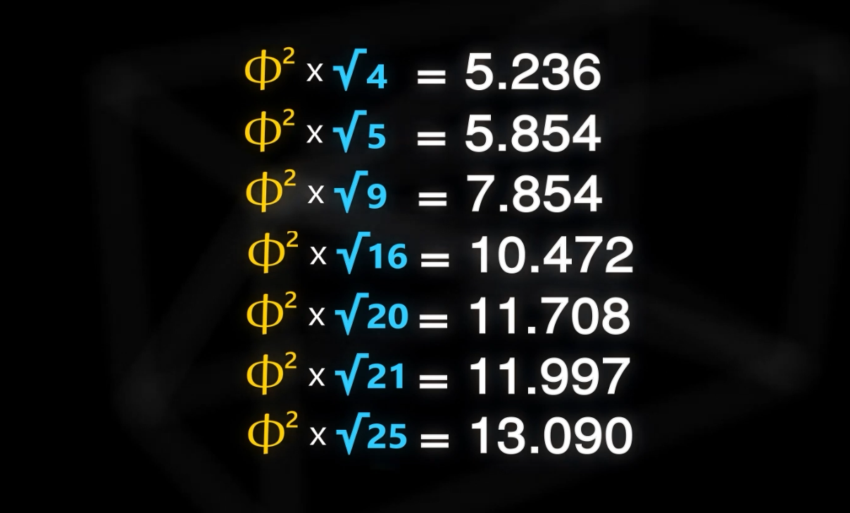 将7个数字计算出平方根,再用黄金比例的平方分别相乘,我们得到下图中的这样一组数字,这些数字构成这个从地板到天花板的完美墓室,这些数字后面的单位就是我们今天通用的长度单位:米。