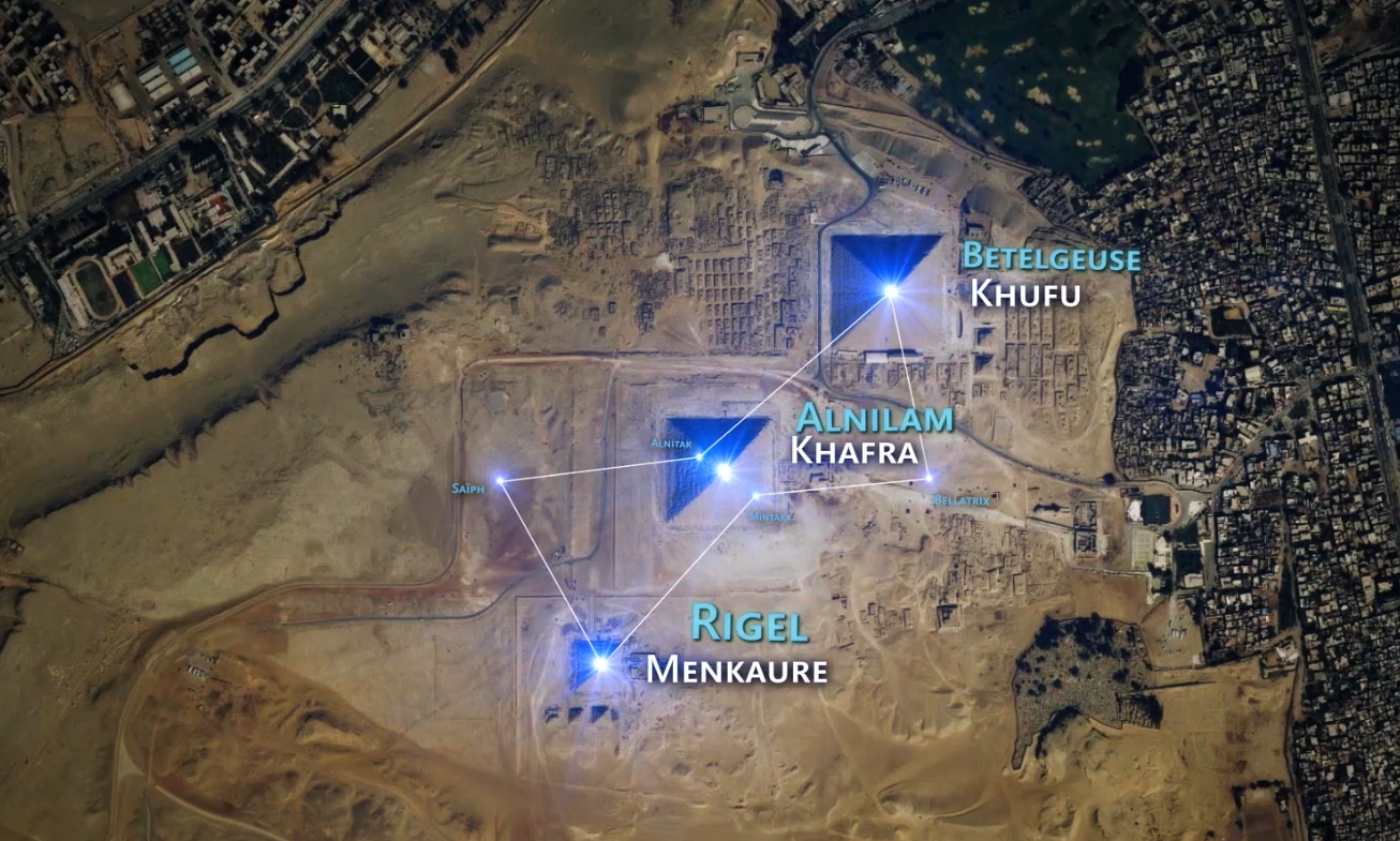 如果利用电脑模拟回到公元前1050年,地上吉萨三大金字塔排列格局,和天上跨越子午线的猎户座三颗腰星的排列完全一样。
