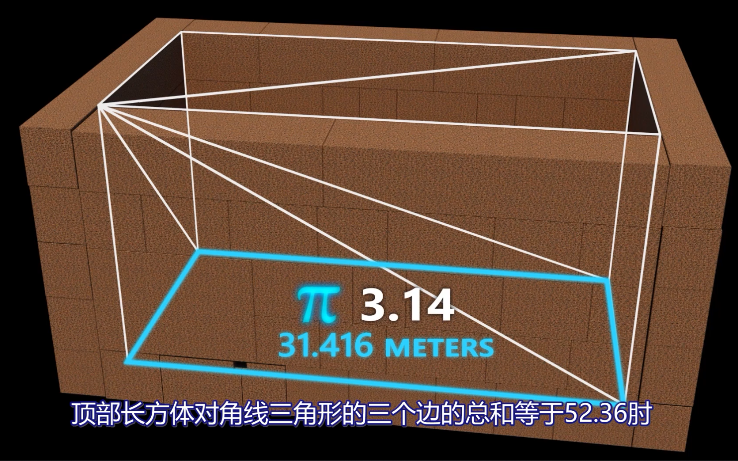 墓室的周长是31.416m,也就是π的10倍,顶部长方体对角线三角形的三个边的总和等于52.36肘。“52.36”是一个神奇的数字,被称为皇家常数。
