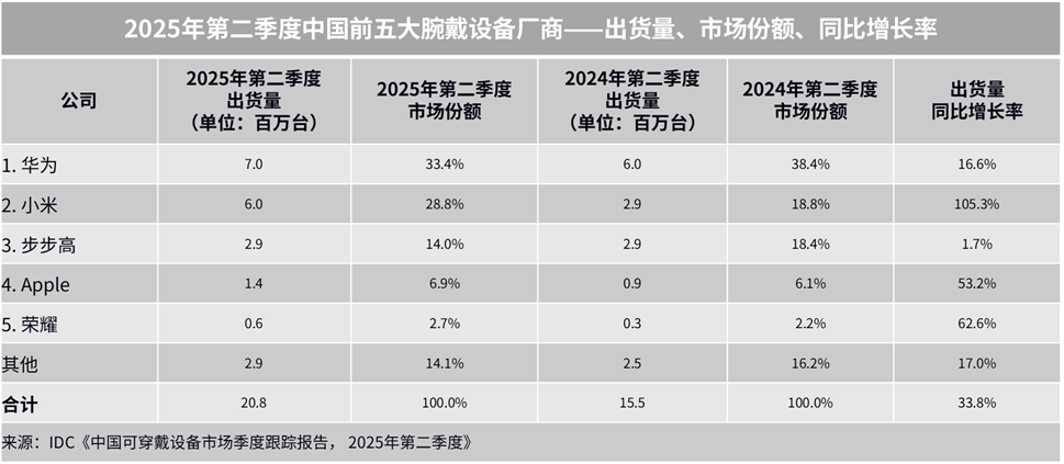 对比而言,虽然2019年后,荣耀也开始布局IoT相关业务,推出了智能电视、智能手表、平板电脑等产品,但在这些领域,荣耀品牌的影响力颇为有限。以腕带设备为例,IDC披露的数据显示,2025年Q2,中国腕带设备市场,荣耀出货量仅为60万台,只占据2.7%的市场份额,聊胜于无。