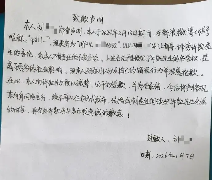 许凯名誉权案再胜诉,黑粉发布手写致歉声明,承认不实言论侵权
