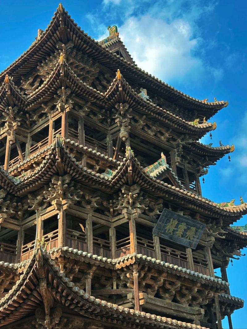 飞云楼·木构巅峰:看“明三层暗五层”结构(外观三层,内有五层回廊),数清“365攒斗拱”(象征一年天数),观察“檐角风铃”(明代铸铁,刻“风调雨顺”);