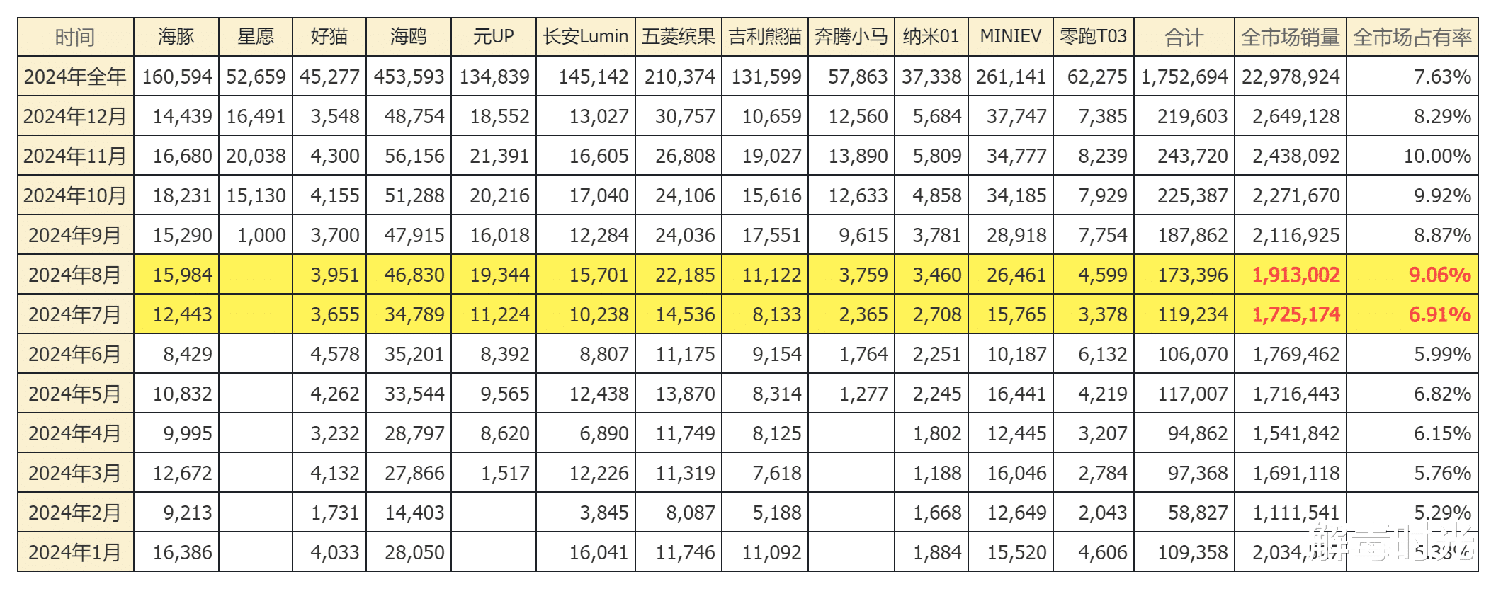 如今的新能源市场上,有一些价格在10万元以下的纯电产品,由于价格不高,很容易受到市场上价格波动的影响,可以说是市场价格变动的晴雨表。对此,在选择12款产品作为参考,并对它们在2024年的销量进行研究时发现,这12款车的合计销量,在8月有了一个明显的上升,在全市场的占有率一跃提升了两个点,而此后也能相对稳定在9%上下。