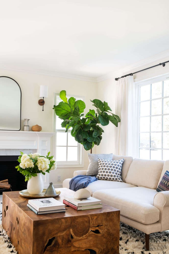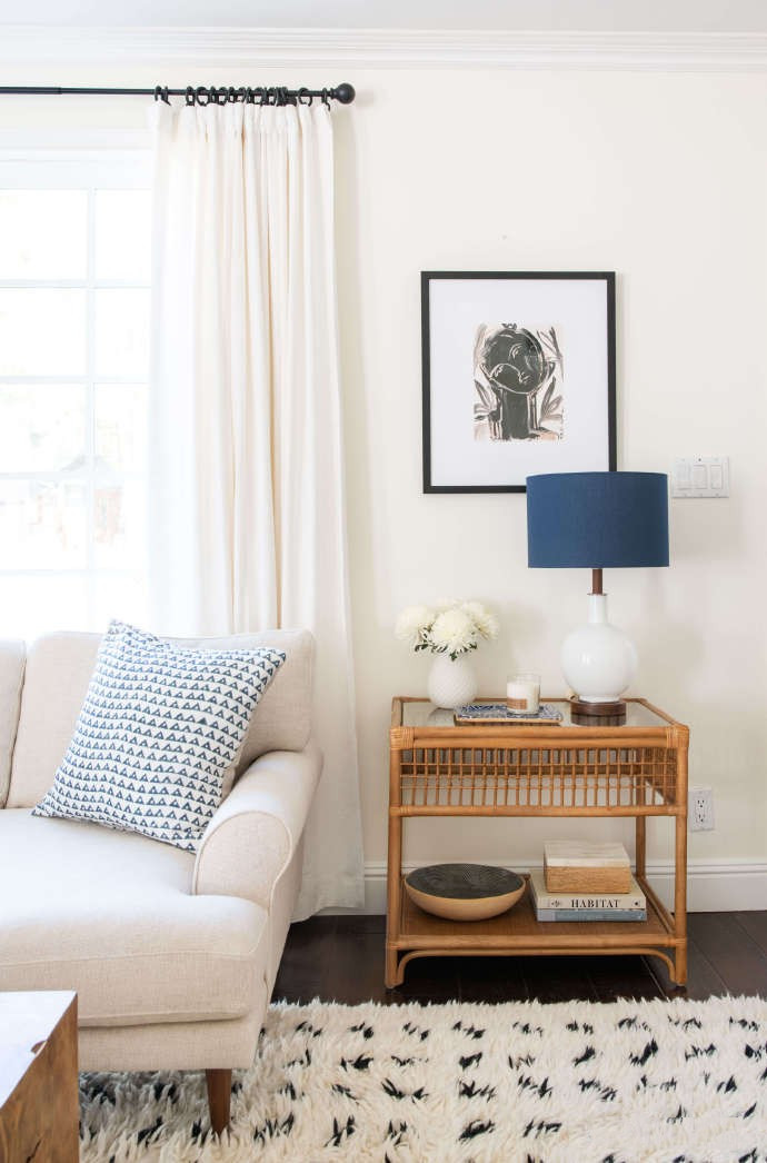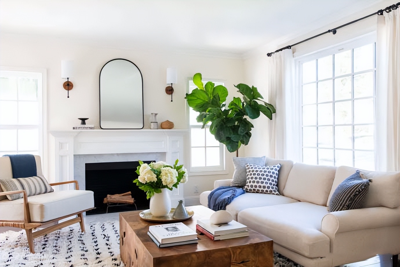 室内的空间比较宽敞,在沙发的旁边放置一张实木的收纳桌,有种中式风格的味道,本以为是乱搭,没想到效果这么好看。