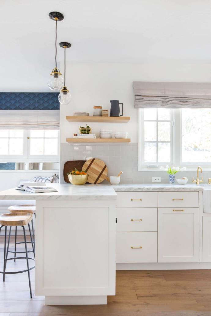 厨房的空间是开放式的空间,这样的空间不适合做大油烟的菜式,但是橱柜的定制非常的好看和大气,比如这种大理石纹的石板,实用又好看,而且质感也超好。橱柜用白色的柜门加金属色的手把,精美又好看。
