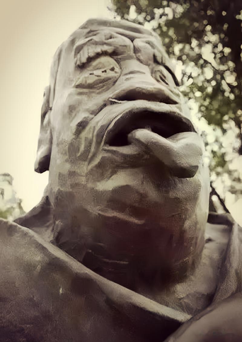 雕塑里的老子,眼睛眯着,嘴巴大张,舌头直接伸了出来,嘴里还就剩一颗门牙。
