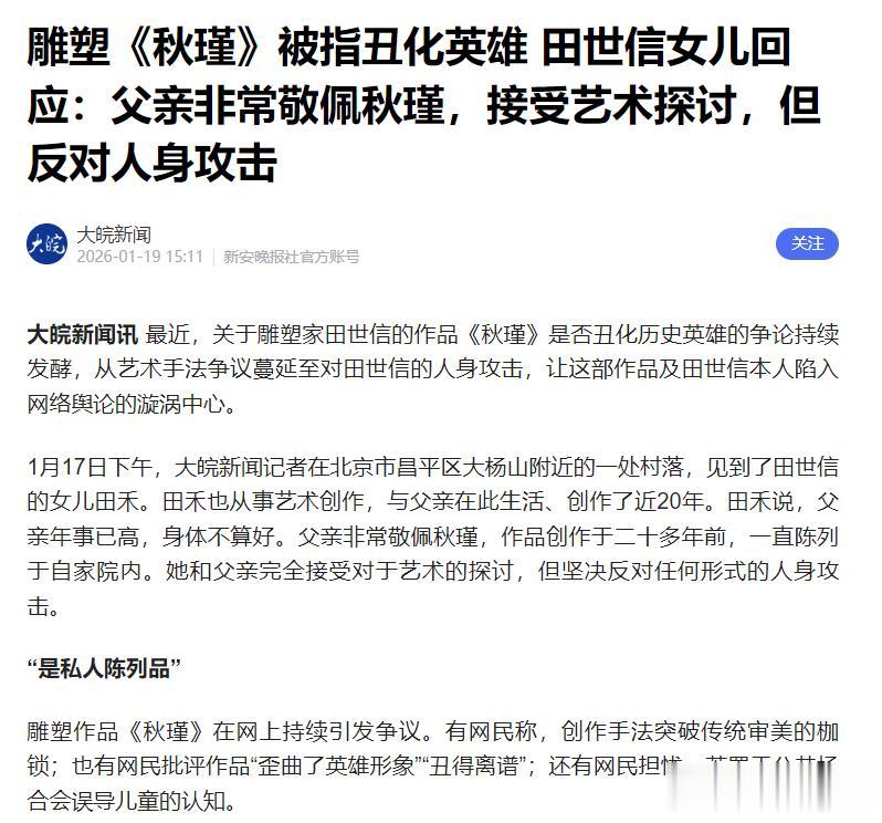 信息来源:雕塑《秋瑾》被指丑化英雄 田世信女儿回应:父亲非常敬佩秋瑾,接受艺术探讨,但反对人身攻击