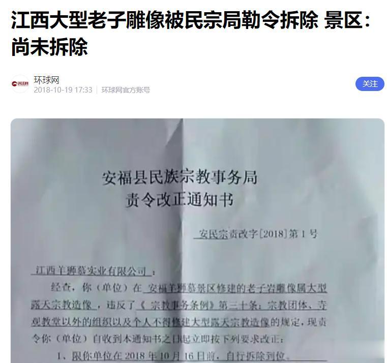 信息来源:江西大型老子雕像被民宗局勒令拆除 景区:尚未拆除