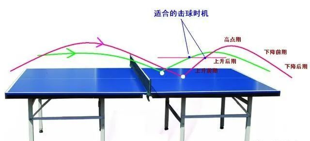 乒乓球弹起后的轨迹可分为上升期、高点期和下降期三大阶段。更细致划分还包括上升前期、上升后期、高点期、下降前期、下降后期五个部分。不同技术动作适合在不同阶段完成:攻球适合在上升期到高点期之间,前冲弧圈球适合高点期到下降前期,而加转弧圈球或削球则更适合在下降后期击打。