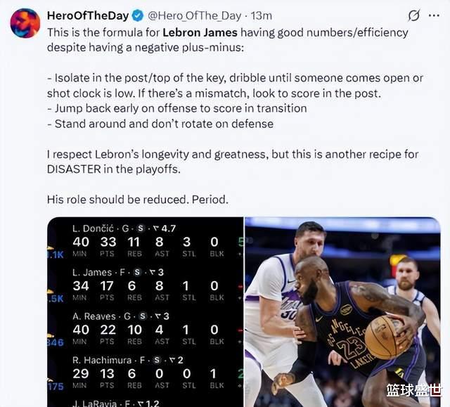 美媒网站HerofTheDay第一时间分享了“詹姆斯数据好看,但正负值最差”的原因: