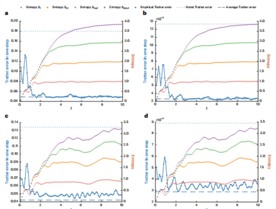 图丨单段时间量子模拟算法(Trotter)误差与纠缠熵变化(来源:Nature Physics)
