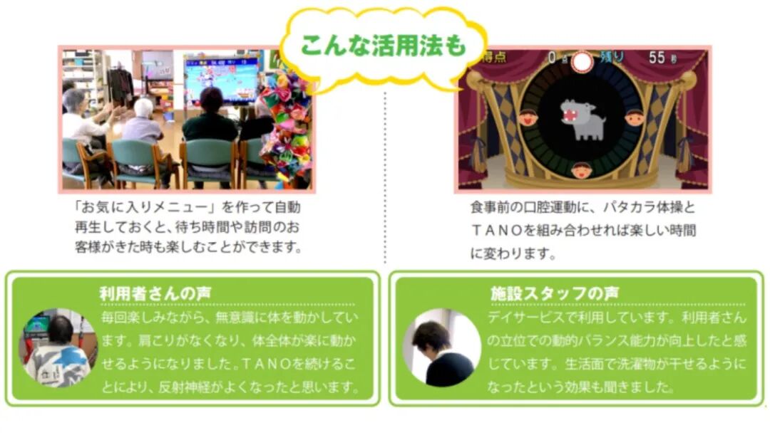 狮王与TANOTECH公司合作研发的护理游戏机TANO-LT于2022年开始发售。该设备搭载超过180种运动模式,其中“健口眠体操”由东京大学医学部附属医院主导研发,能让老年人在享受游戏的同时提升口腔、睡眠和运动器官的健康水平,在游戏过程中还能收集老人的骨骼和声音数据,生成代表六项维持健康重要功能的“活力生活量表”。