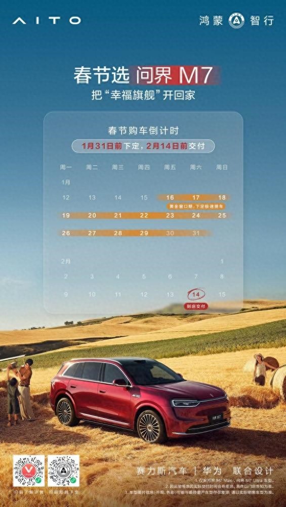随着新春临近,许多人已把“购置新车”提上日程。根据全新问界M7最近发布的新春购车指引信息,即日起至1月31日,下定全新问界M7(Max与Ultra版本)的用户,预计可在2月14日前实现交付,让车主有机会在春节前开上新车。同时,购车还可享受至高60000元的综合权益,让这款“国民SUV幸福旗舰”陪伴更多家庭开启精彩旅程。
