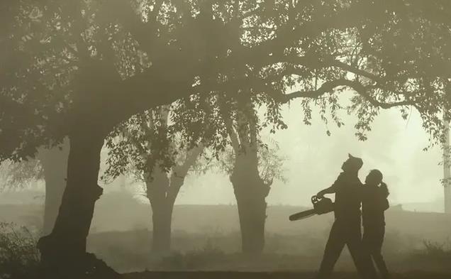 暴怒的父亲拿起电锯,要砍掉超过藏身的大树。