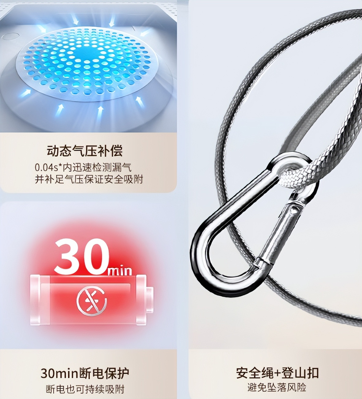 ·电动擦窗机器人怎么选?安全绳得选承重≥150kg的登山级款式,搭配专业锁扣,长度要比窗户高度多1-2米,应对不同层高需求,断电方面,断电后需能维持吸附≥20分钟,高层建议选≥25分钟的,且要有断电报警功能。