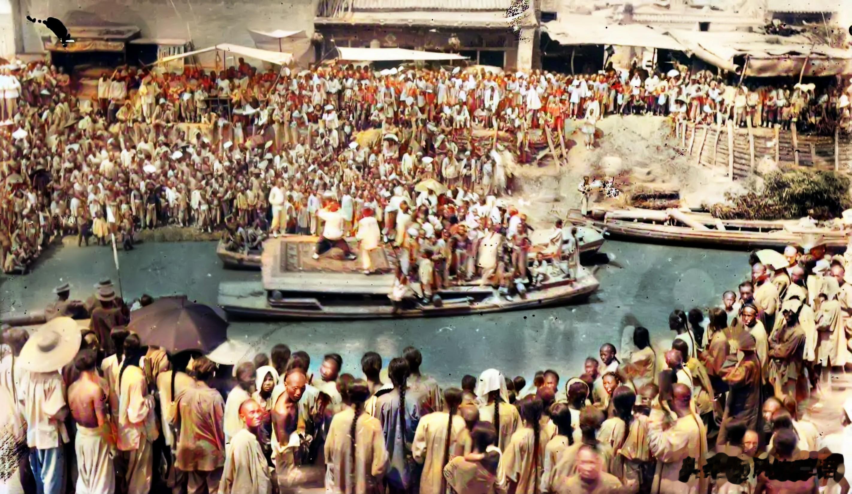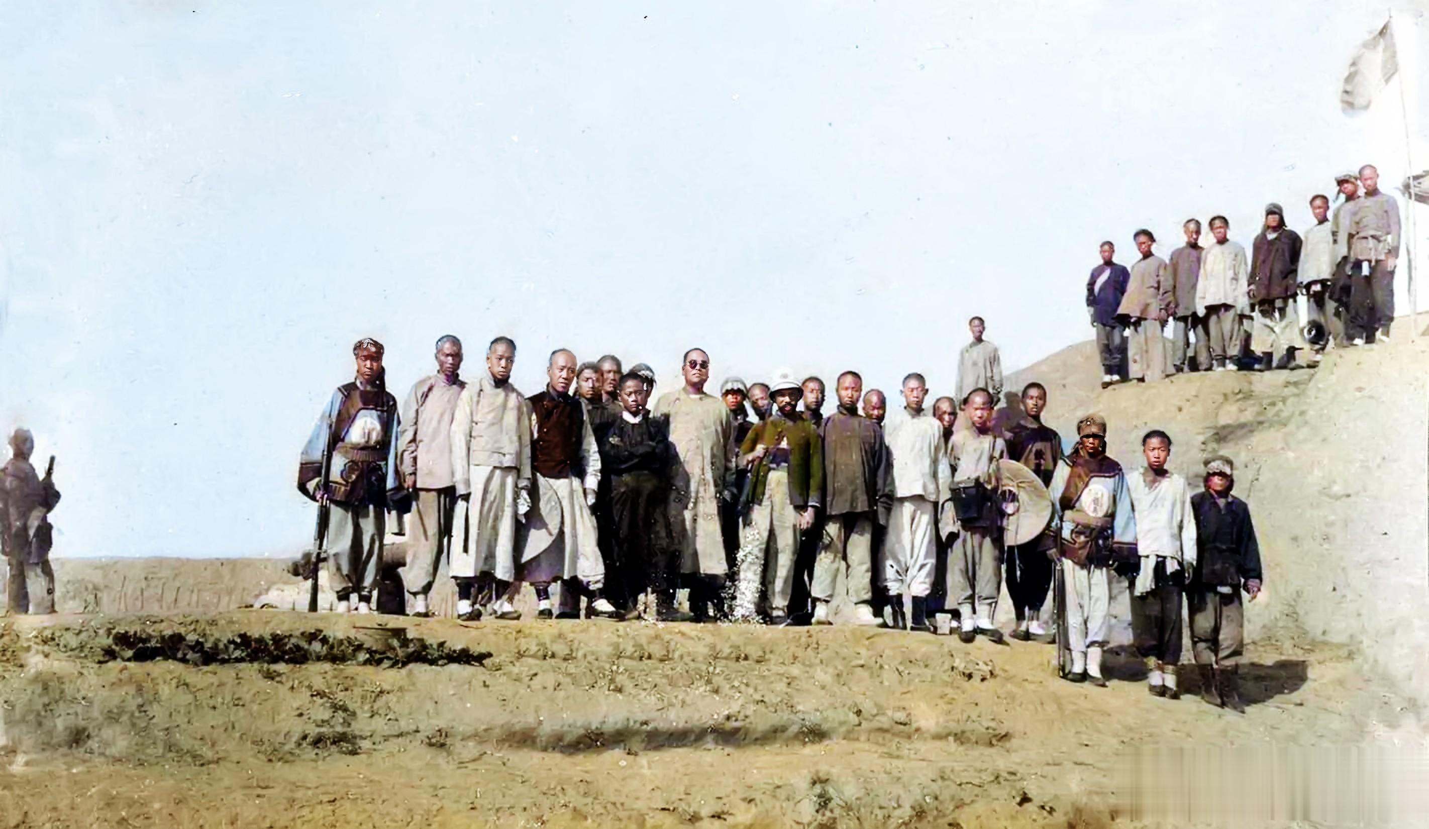 亨利·库洛登岸后站在河边高地上的留影。簇拥他的人群中有拿着武器的乡丁,也有穿着长袍马褂的乡绅,其中甚至还有人戴着墨镜。