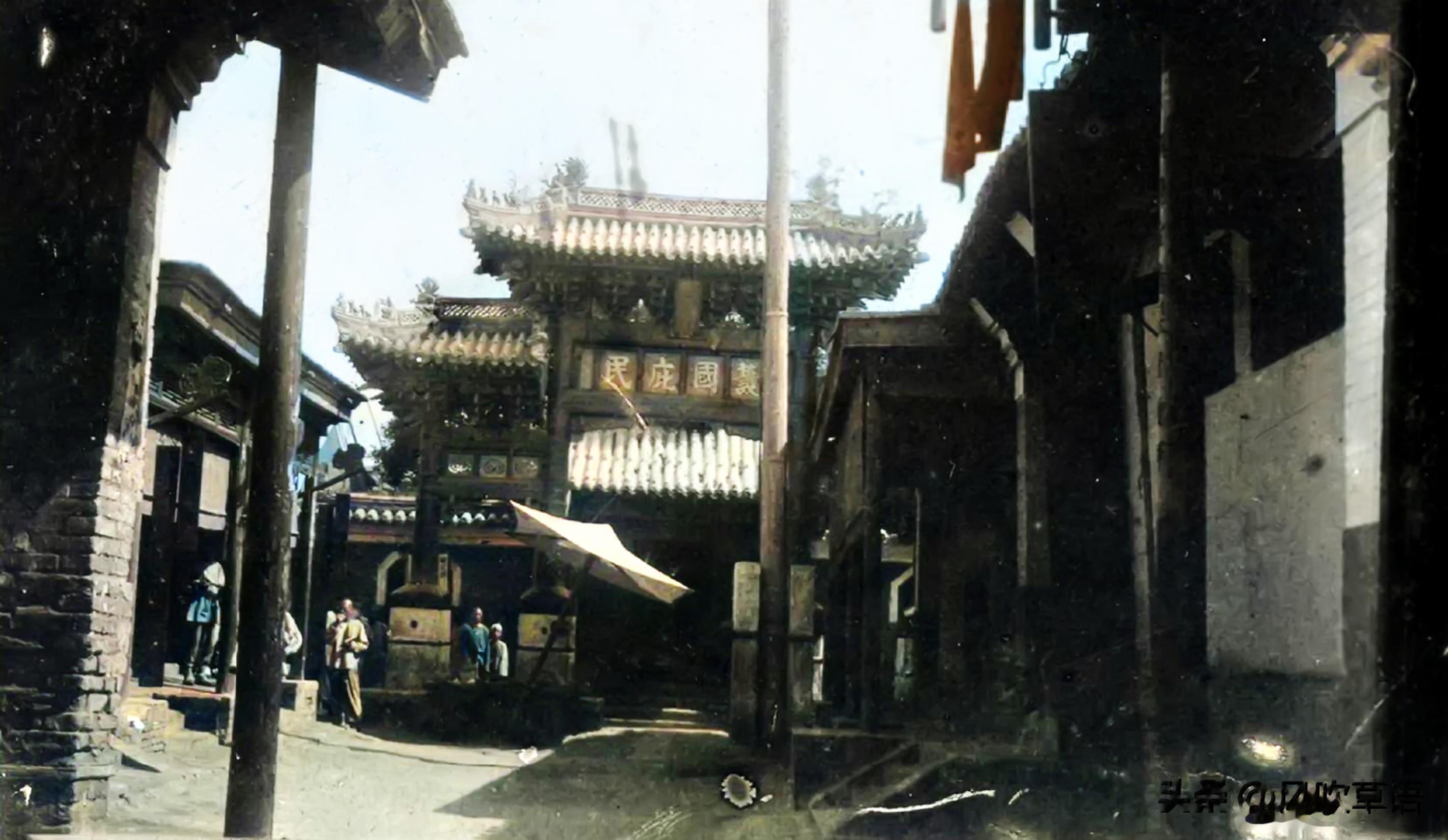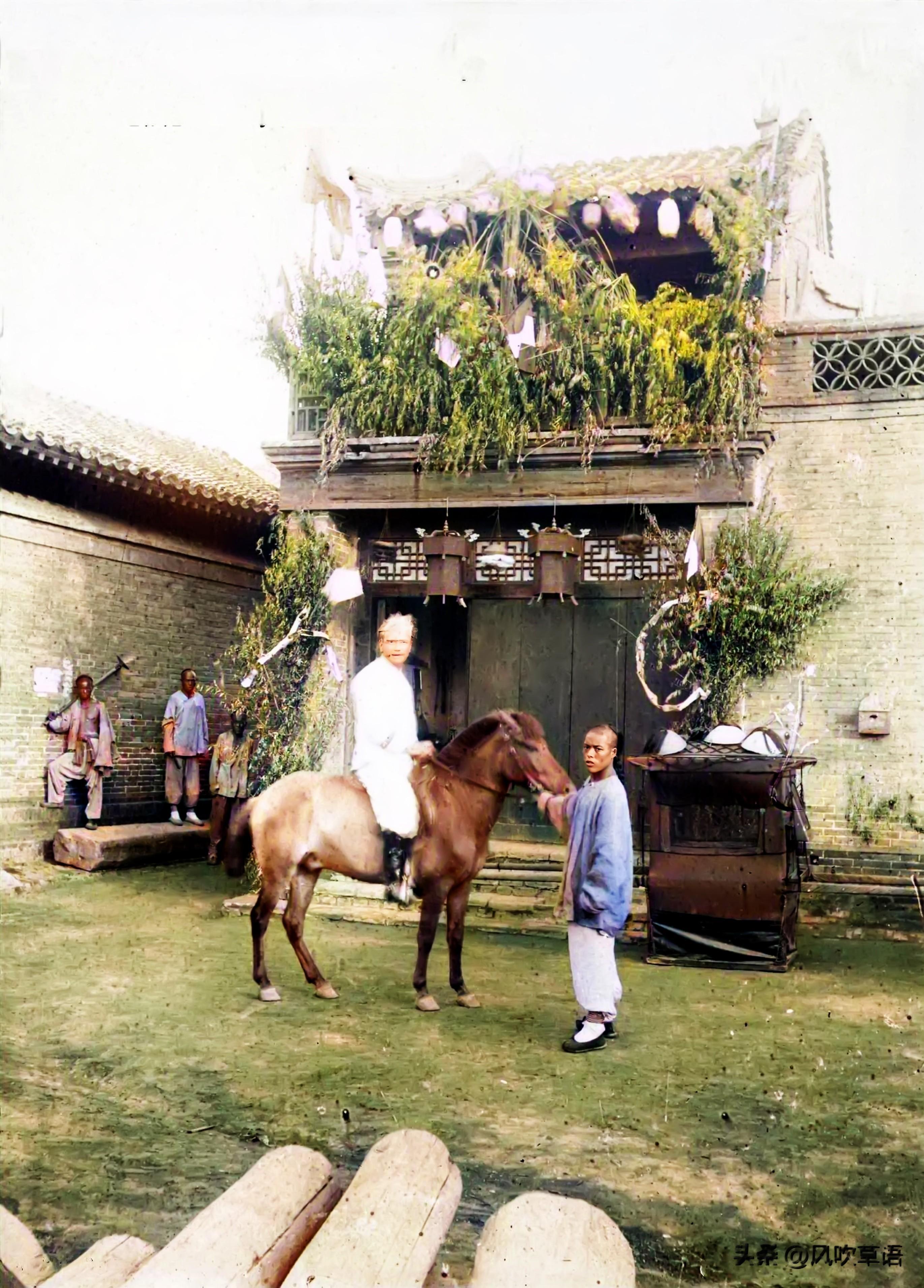 亨利·库洛骑在马背上,在胜芳镇一处客栈前留影。这座门口挂着红灯笼的客栈,一直是他在胜芳活动期间下榻的地方。客栈门口停着一乘轿子,几名当地居民躲在远处看热闹。 1901年9 月7 日《辛丑条约》签订,盘踞在此达一年之久的法国人才撤离胜芳。