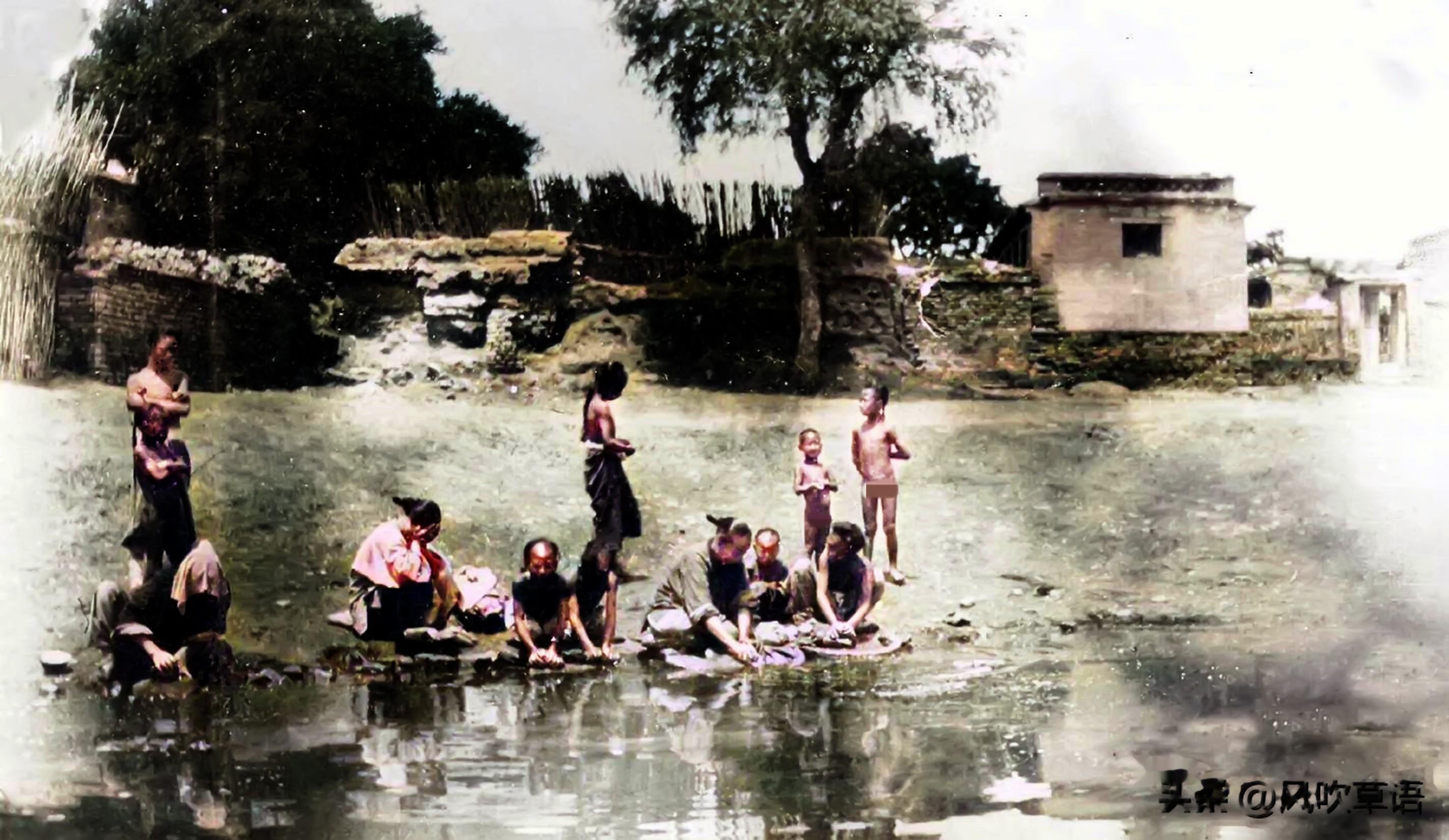 胜芳镇附近的一座村庄, 几名妇女正蹲在河边洗衣服,她们梳着喜鹊尾发型,其中一个发现有人拍照,连忙捂住了面孔。旁边还有几名正在玩耍的小孩子子,一个个衣衫不整。