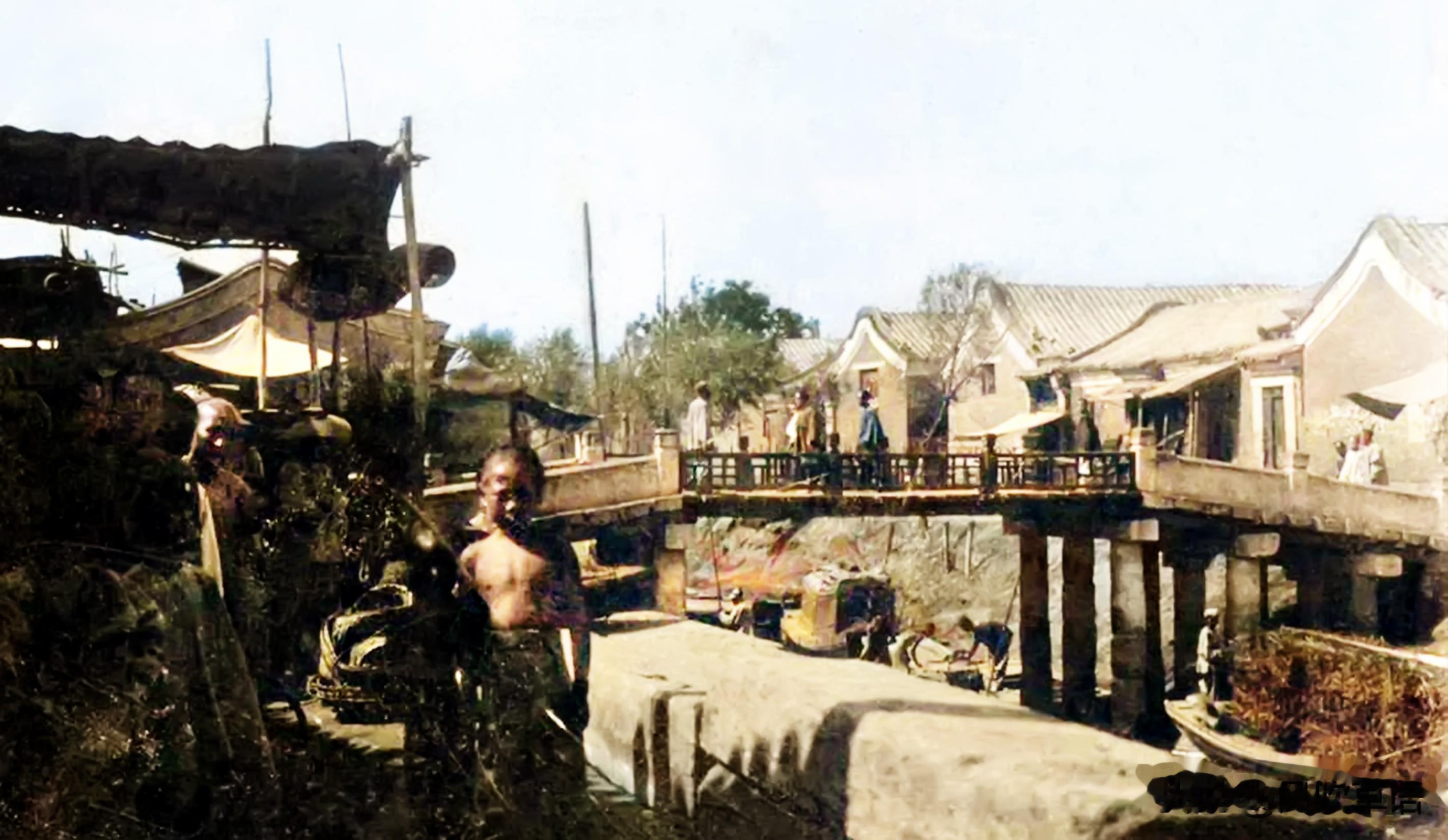 站在中亭河边的一名少年,身后是横跨河面的一座木桥。中亭河流经河北省的保定、廊坊等地,在胜芳镇与东淀相连,是古代向北京运输漕粮、物资的官方黄金水道。