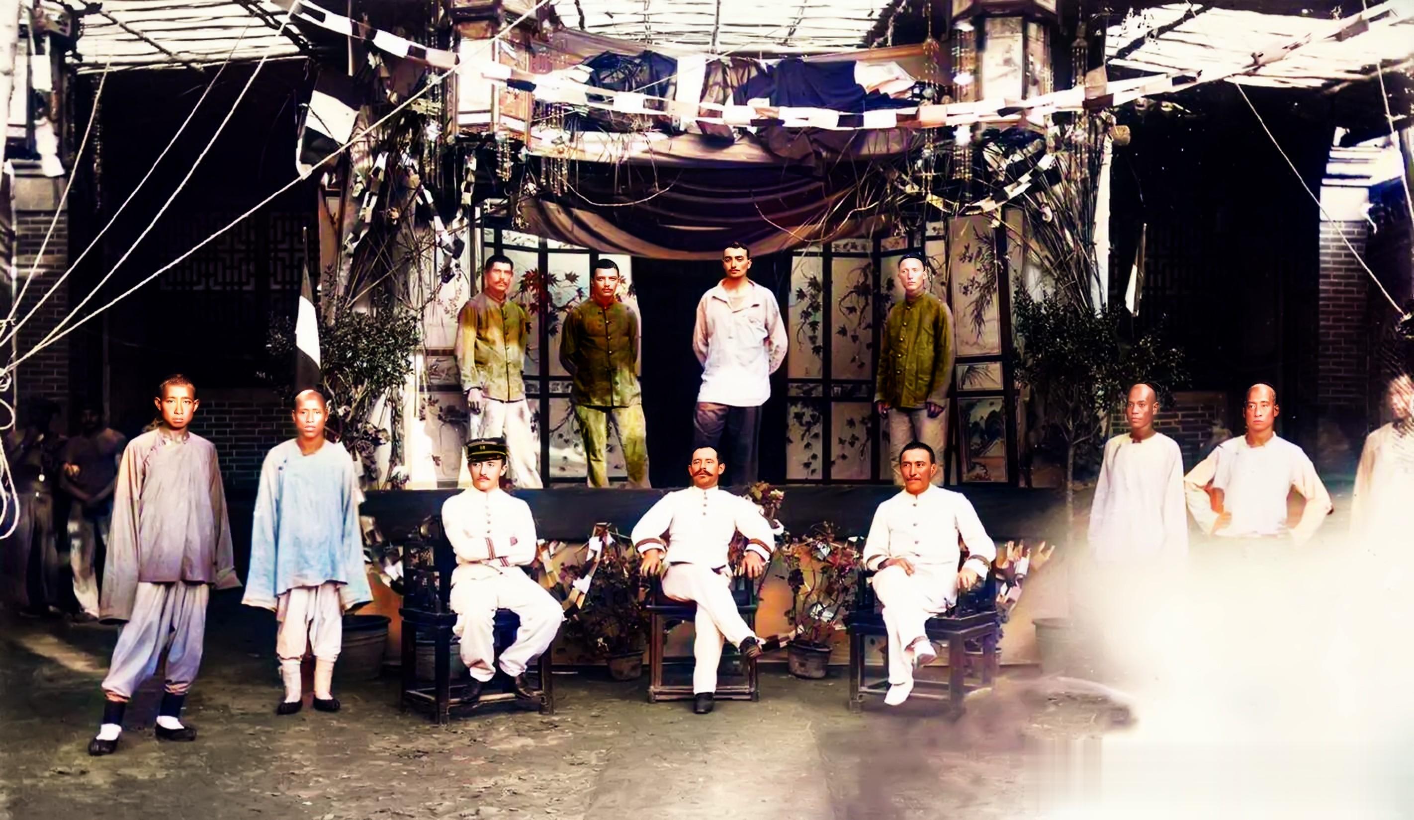 1901年7月14日,驻扎在胜芳的法国军队为迎接第二十二个法国国庆日,举办了一系列的庆祝活动。 图为几名法国人坐在一座新搭建的戏台前,旁边站着中国仆人。