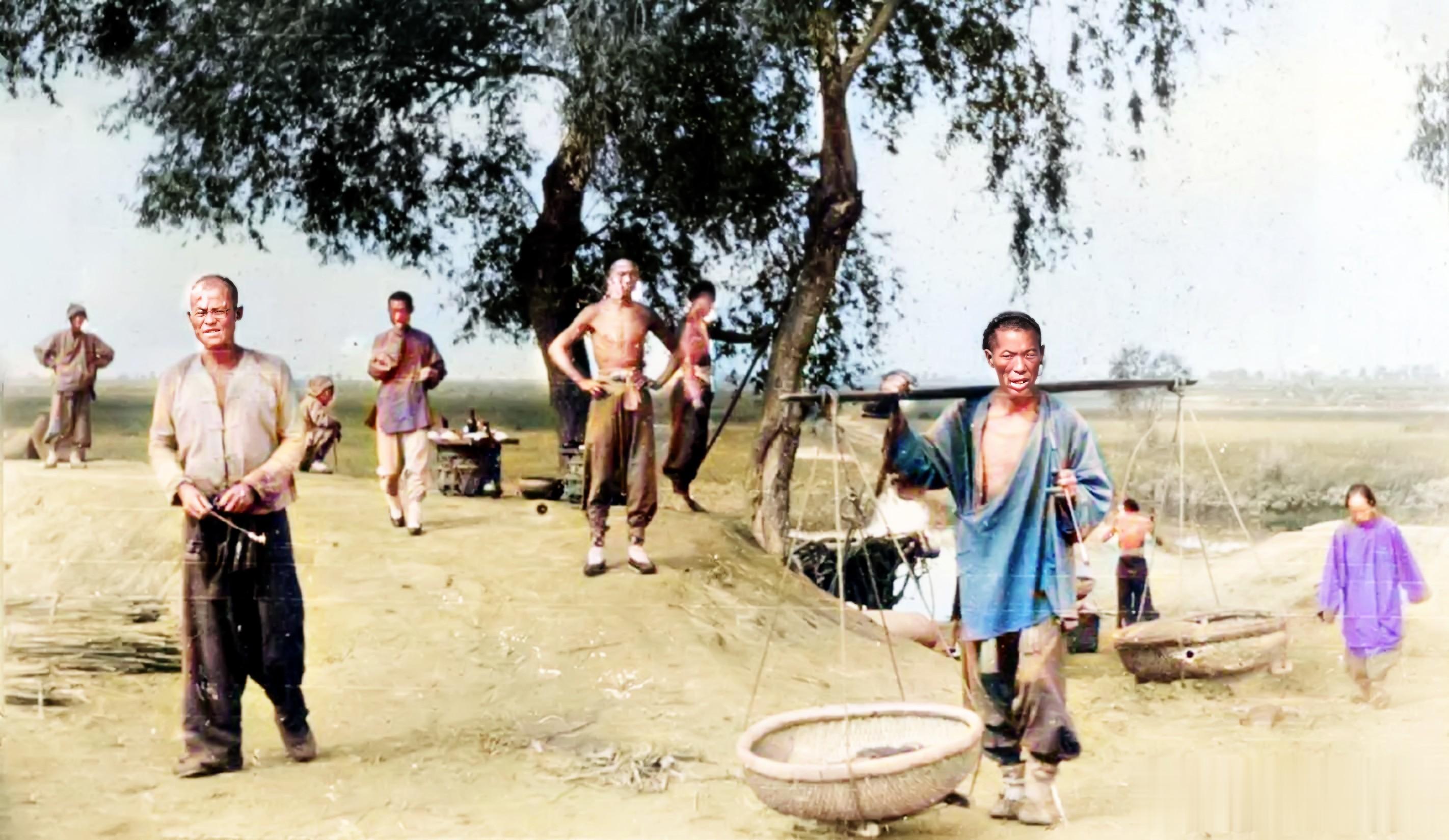 中亭河岸边的坡地上,一名衣衫不整的男子挑着箩筐走向镜头方向,身后有匆匆赶路的女子以及站在树下纳凉的光膀子男子。更远的地方的路边,摆着一个小摊,小贩蹲在地上等待有客人光顾。