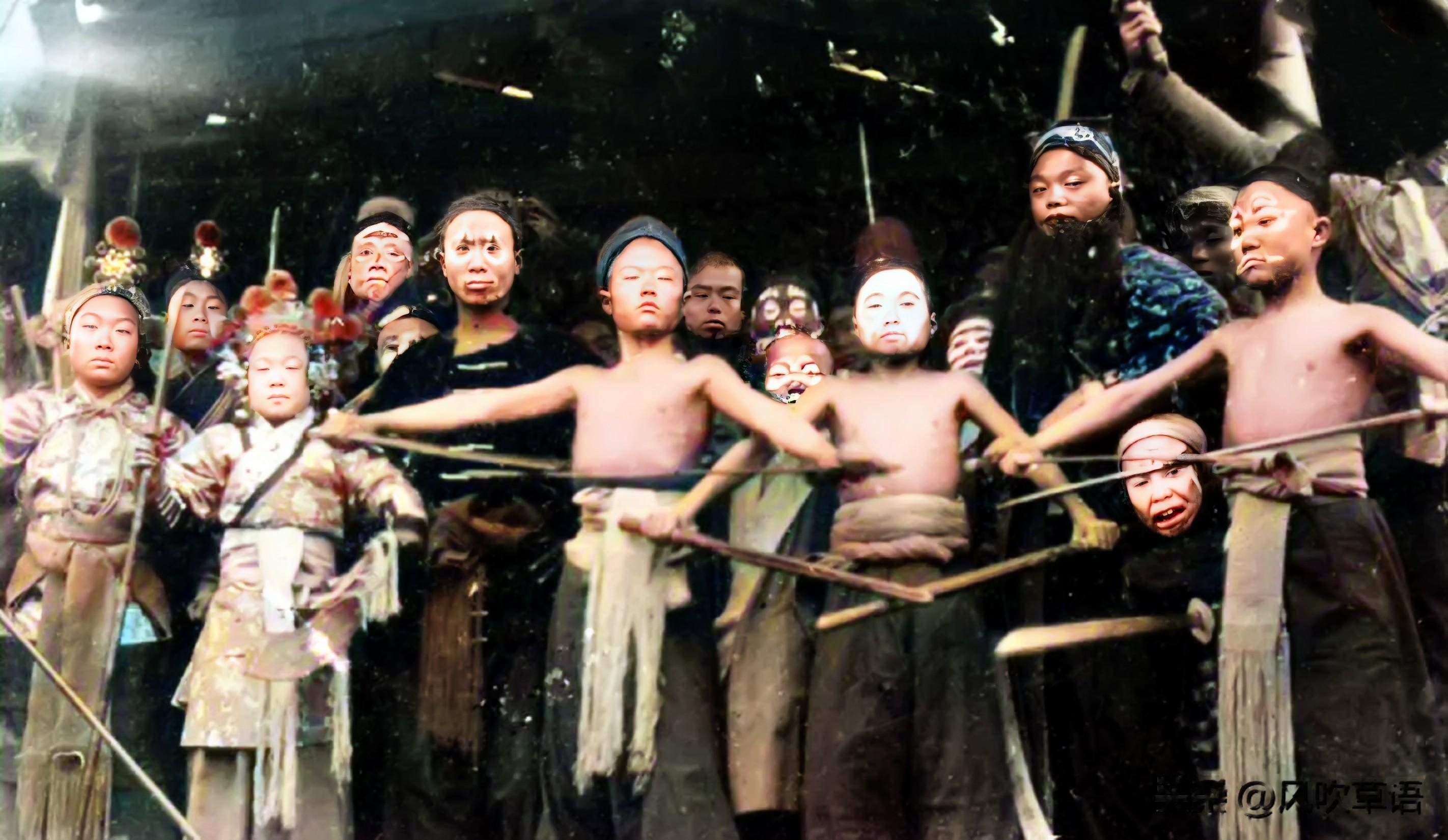 为增添节日气氛,法国人除了雇佣民间艺人进行水上表演外,还邀请了戏台班子。图为活动期间的戏台,站在前排是三名光着上身的少年,手里握着道具摆架势。演员们有的勾画了脸谱,有的则素面穿着戏服,显然是演出之后的摆拍。