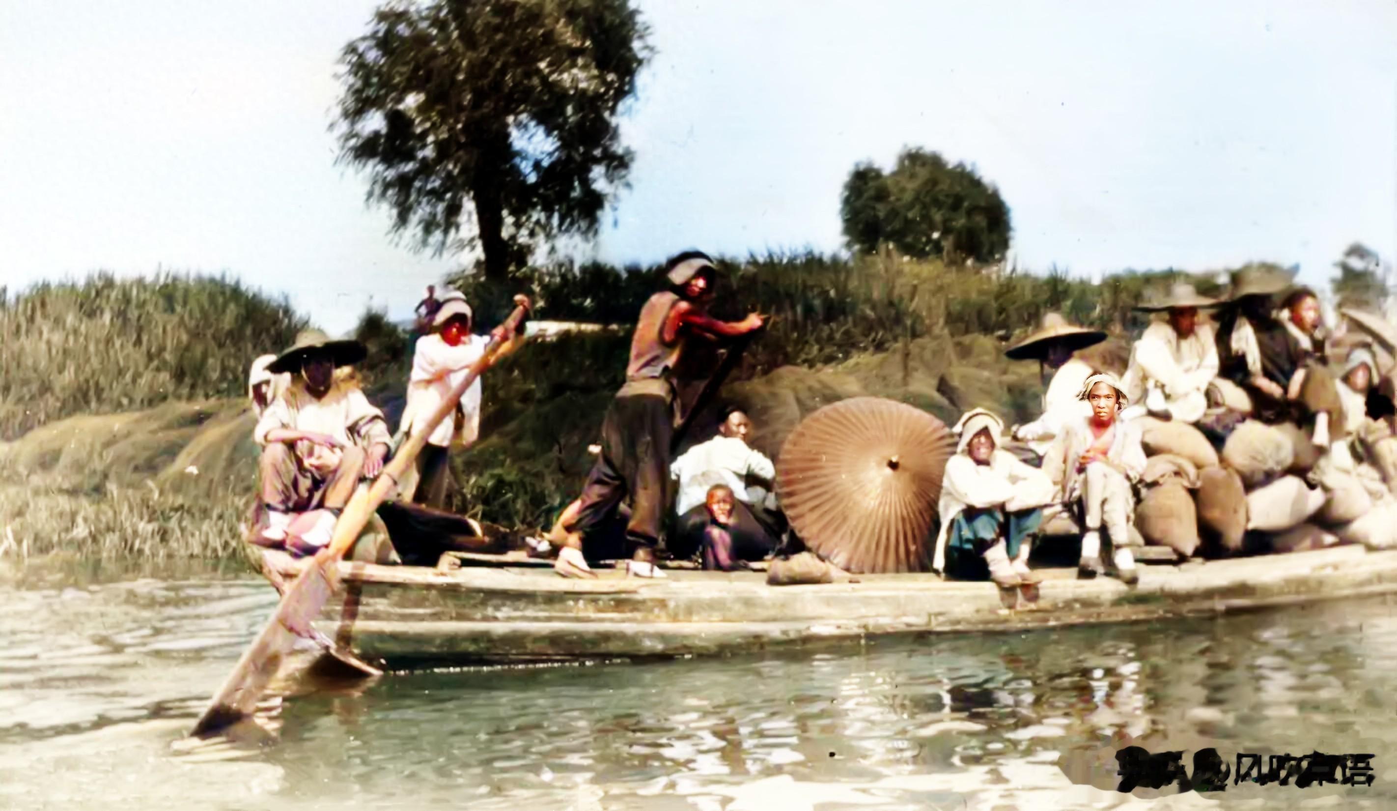 中亭河上的载客船,两名顶着毛巾的船夫在船尾摇桨,船舱和船头满是货物和客人。这条水路,是当年胜芳古镇和周边交通的重要通道。