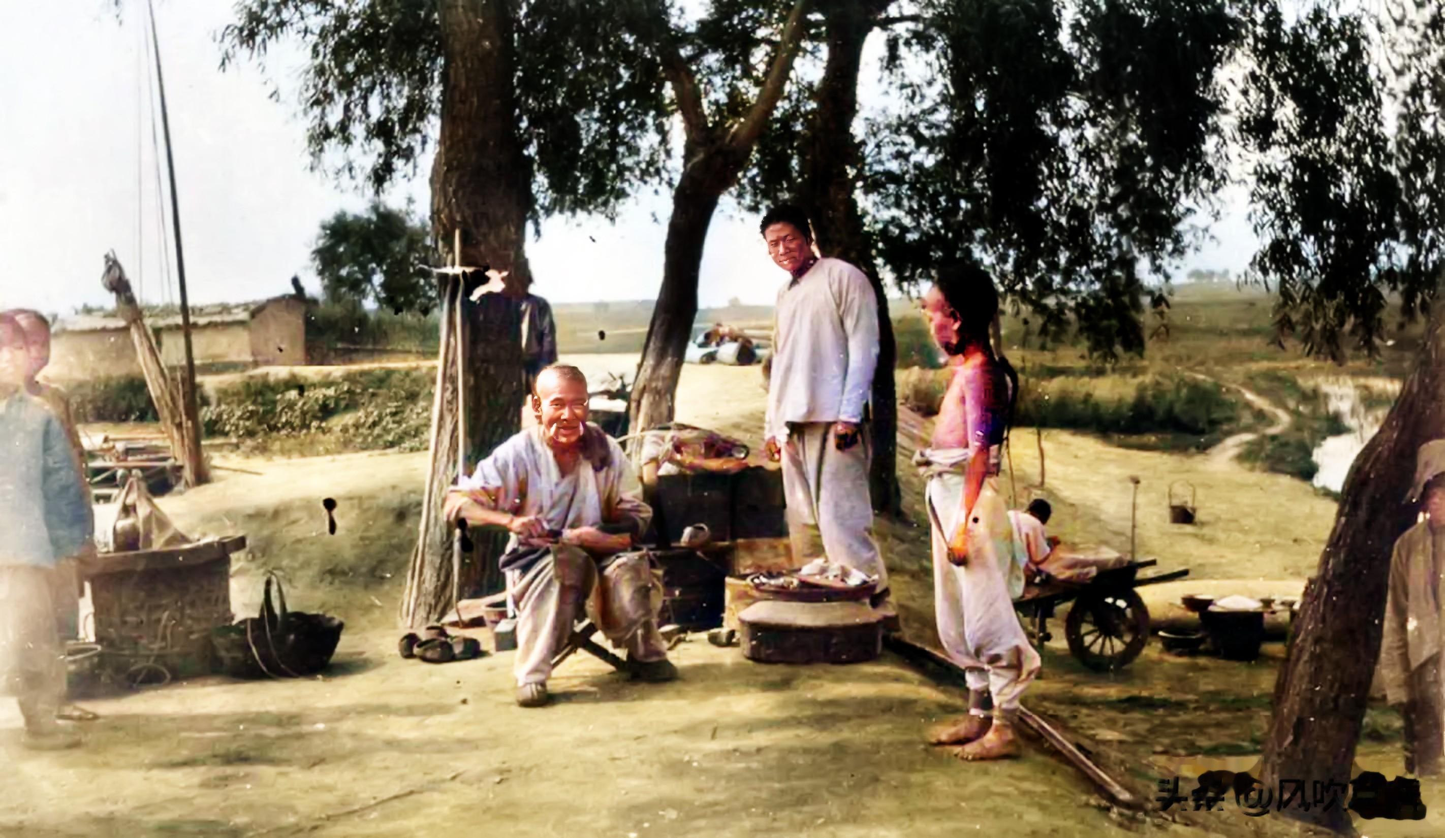 堤岸上不但有小商贩摆摊卖货,还有一名老年修鞋匠,说明这里已经形成了一个小小的集市。一个小男孩光着双脚站在旁边,等待老人帮他把鞋修好。