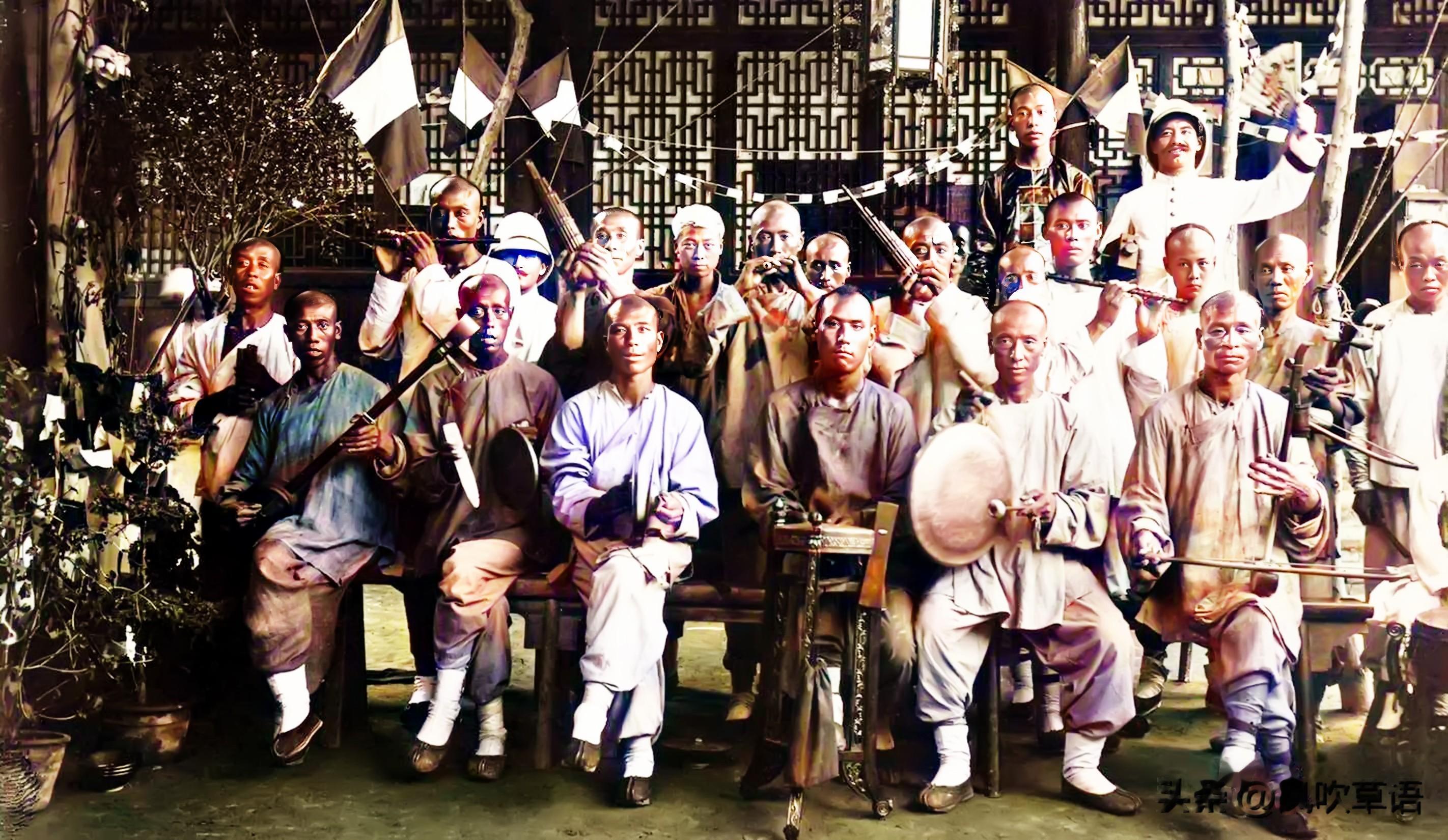 一支民间乐队坐在法国驻地庭院里的合影。他们拿着各种传统乐器做出演奏的模样,旁边挂着法国国旗,有两名法国士兵混在人群后面。