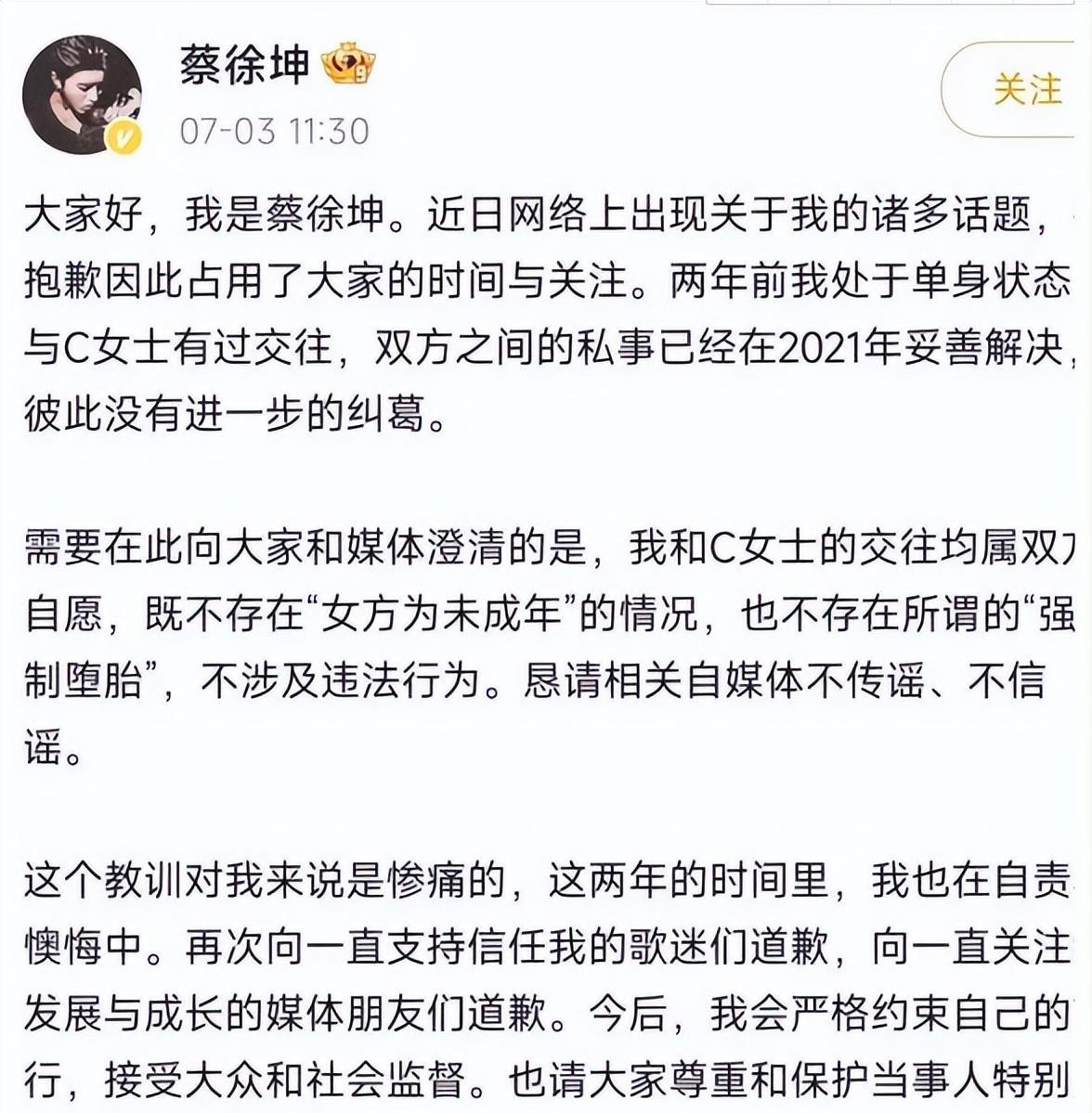 却没曾想蔡徐坤发动态表示自己并没有与未成年发生不正当的关系。